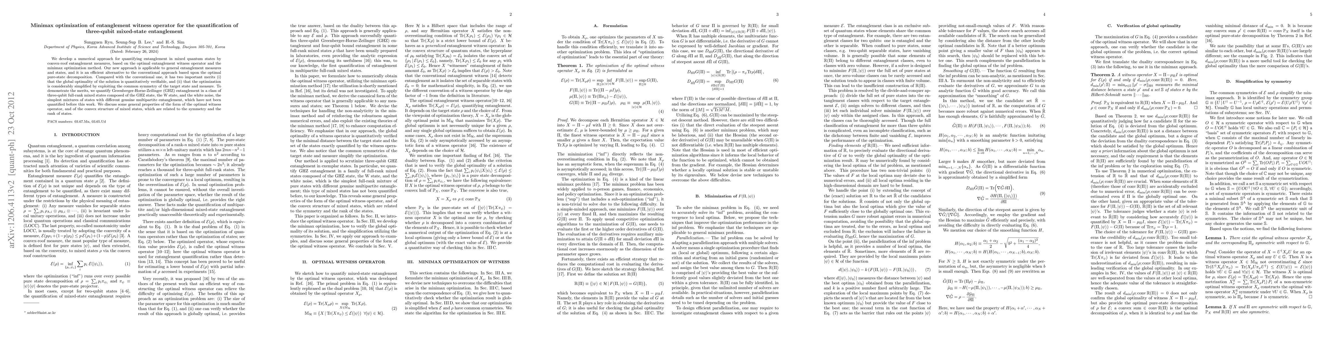 This paper proposes a numerical method for quantifying entanglement in mixed quantum states using convex-roof measures and minimax optimization. It offers a simplified and globally verifiable alternative to traditional pure-state decomposition methods, demonstrated through the quantification of GHZ entanglement in three-qubit mixed states.