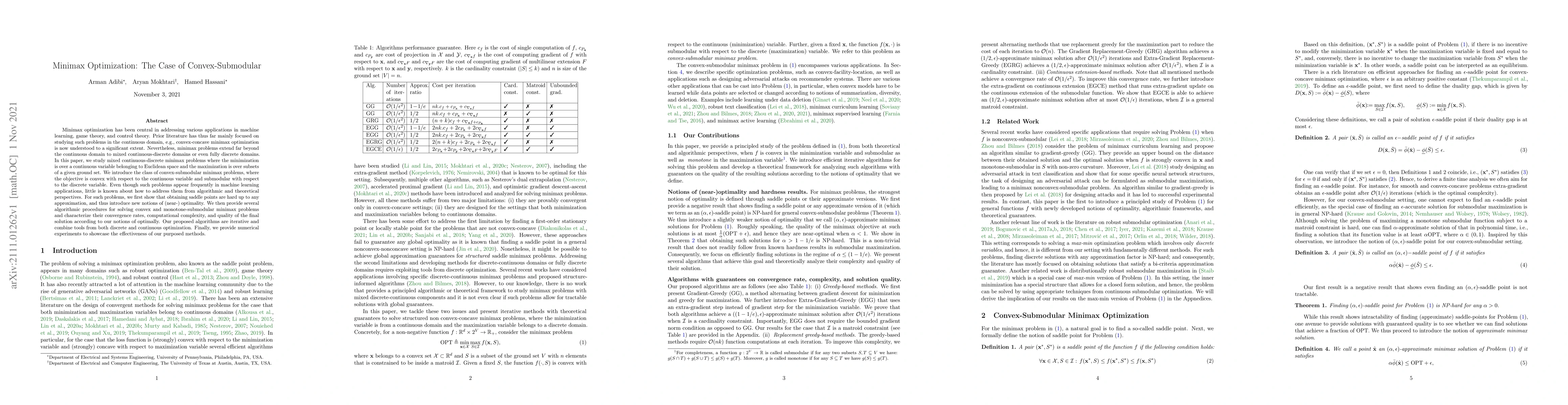 This paper investigates mixed continuous-discrete minimax optimization problems where the objective is convex in a continuous variable and submodular in a discrete variable. It introduces new notions of optimality due to the computational difficulty of finding exact saddle points and proposes iterative algorithms combining discrete and continuous optimization techniques to solve these convex-submodular minimax problems, demonstrating their effectiveness through numerical experiments.