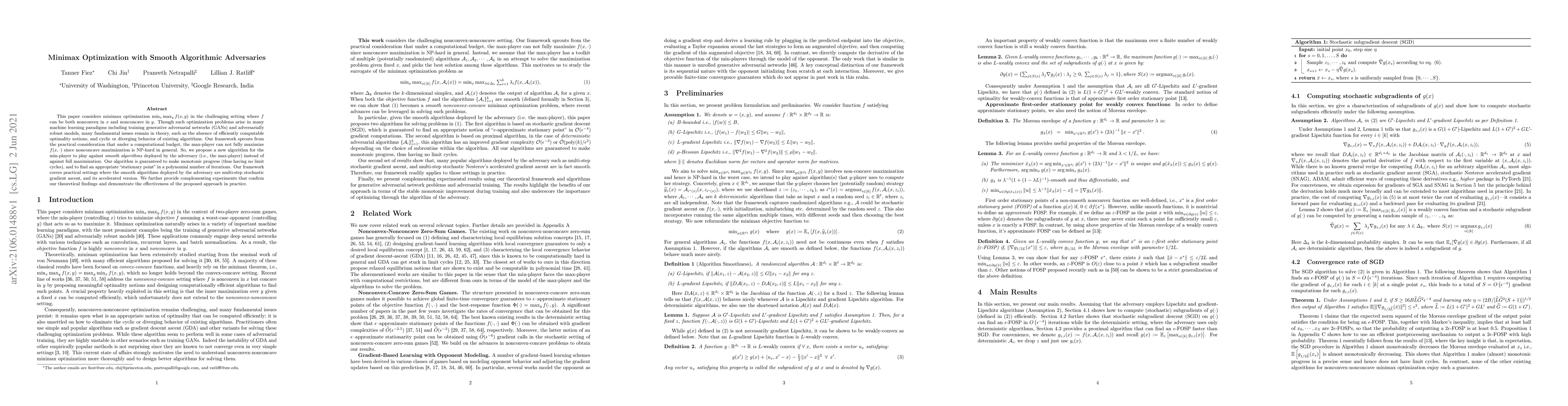 This paper considers minimax optimization $\min_x \max_y f(x, y)$ in the challenging setting where $f$ can be both nonconvex in $x$ and nonconcave in $y$. Though such optimization problems arise in many machine learning paradigms including training generative adversarial networks (GANs) and adversarially robust models, many fundamental issues remain in theory, such as the absence of efficiently computable optimality notions, and cyclic or diverging behavior of existing algorithms. Our framework sprouts from the practical consideration that under a computational budget, the max-player can not fully maximize $f(x,\cdot)$ since nonconcave maximization is NP-hard in general. So, we propose a new algorithm for the min-player to play against smooth algorithms deployed by the adversary (i.e., the max-player) instead of against full maximization. Our algorithm is guaranteed to make monotonic progress (thus having no limit cycles), and to find an appropriate "stationary point" in a polynomial number of iterations. Our framework covers practical settings where the smooth algorithms deployed by the adversary are multi-step stochastic gradient ascent, and its accelerated version. We further provide complementing experiments that confirm our theoretical findings and demonstrate the effectiveness of the proposed approach in practice.