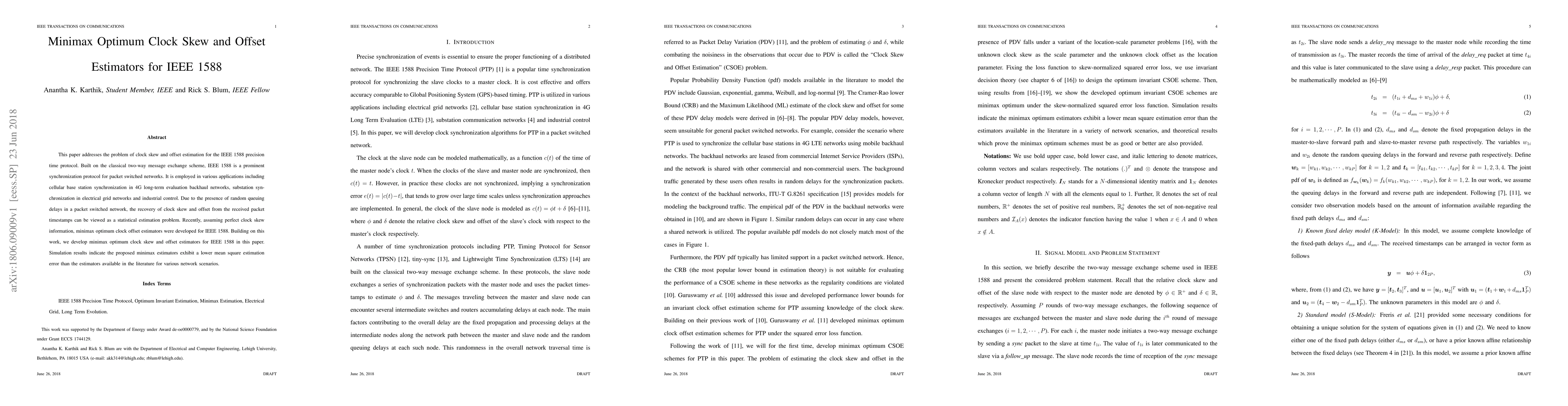 This paper develops minimax optimum estimators for clock skew and offset in IEEE 1588 precision time protocol, improving upon existing methods and achieving lower mean square estimation error in various network scenarios. Simulation results demonstrate superior performance over current estimators.