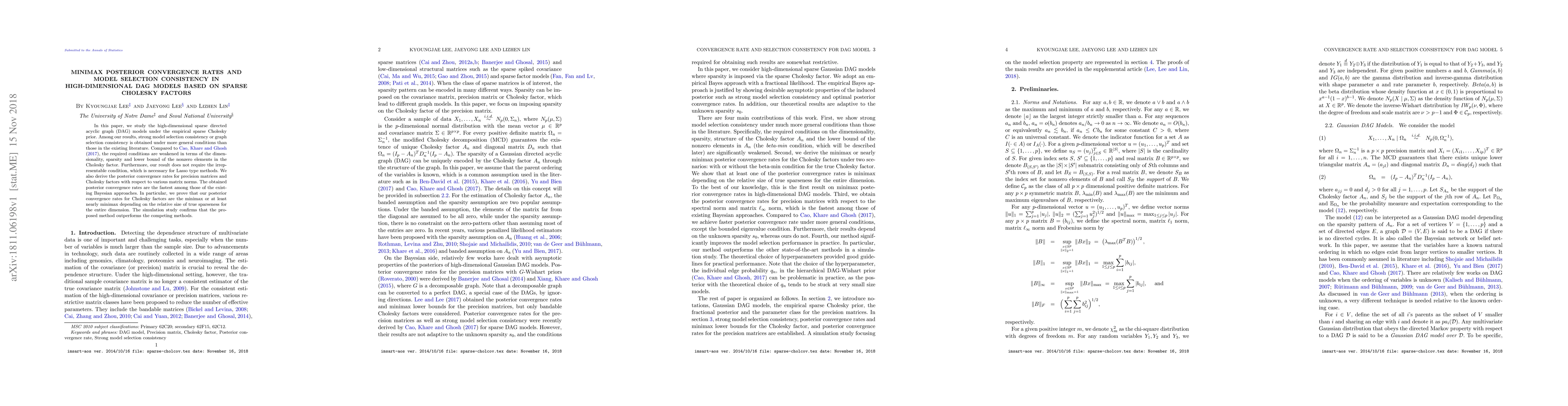 This paper investigates high-dimensional sparse directed acyclic graph (DAG) models using an empirical sparse Cholesky prior, achieving stronger model selection consistency under relaxed conditions compared to prior work. It also establishes the fastest posterior convergence rates for precision matrices and Cholesky factors, proving minimax rates for the latter.
