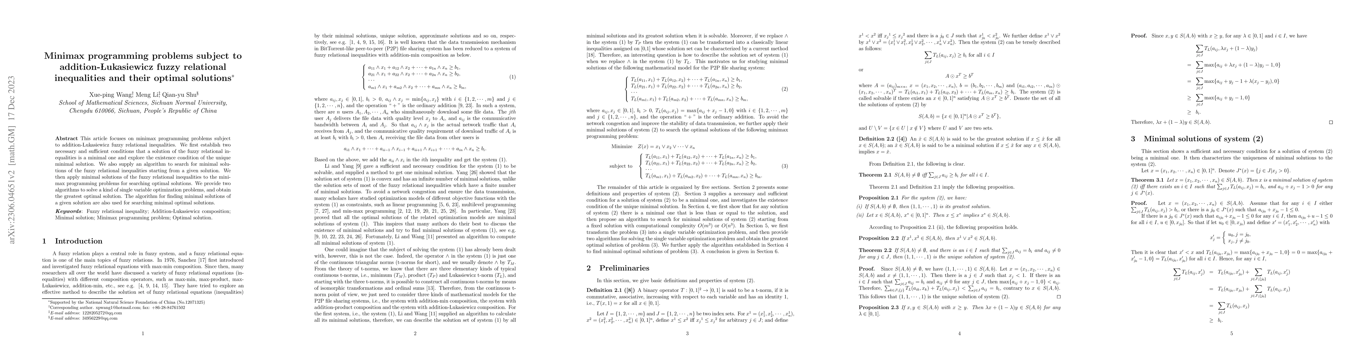 This article focuses on minimax programming problems subject to addition-{\L}ukasiewicz fuzzy relational inequalities. We first establish two necessary and sufficient conditions that a solution of the fuzzy relational inequalities is a minimal one and explore the existence condition of the unique minimal solution. We also supply an algorithm to search for minimal solutions of the fuzzy relational inequalities starting from a given solution. We then apply minimal solutions of the fuzzy relational inequalities to the minimax programming problems for searching optimal solutions. We provide two algorithms to solve a kind of single variable optimization problems, and obtain the greatest optimal solution. The algorithm for finding minimal solutions of a given solution are also used for searching minimal optimal solutions.