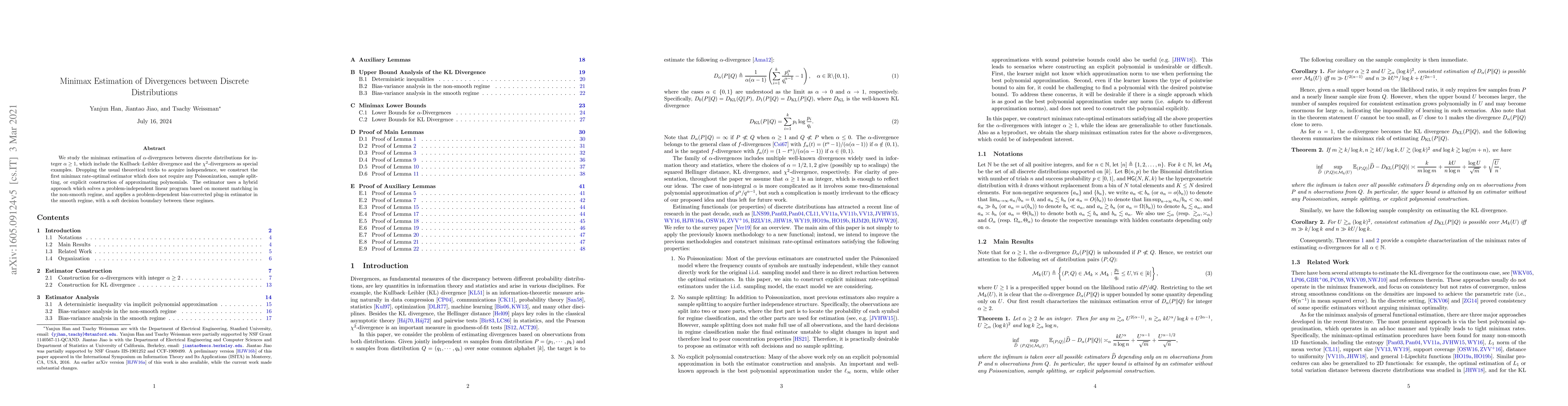 This paper presents a novel minimax rate-optimal estimator for $\alpha$-divergences between discrete distributions, avoiding traditional independence techniques. It employs a hybrid approach combining a problem-independent linear program and a problem-dependent bias-corrected plug-in estimator, with a soft decision boundary between non-smooth and smooth regimes.