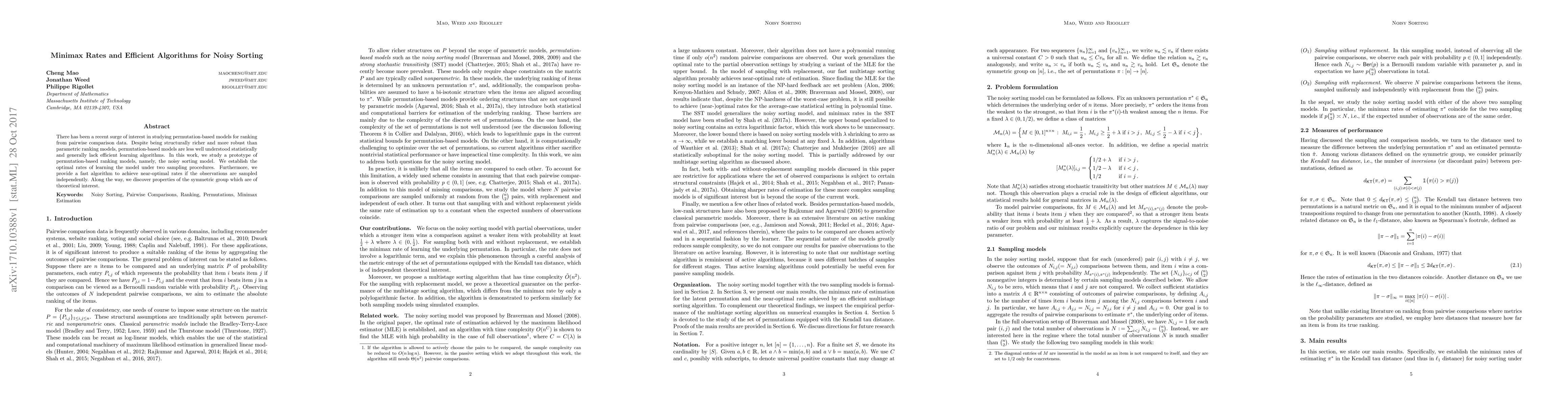 This paper investigates the noisy sorting model for permutation-based ranking, establishing optimal learning rates under different sampling methods. It also introduces an efficient algorithm to achieve near-optimal performance when observations are independently sampled.