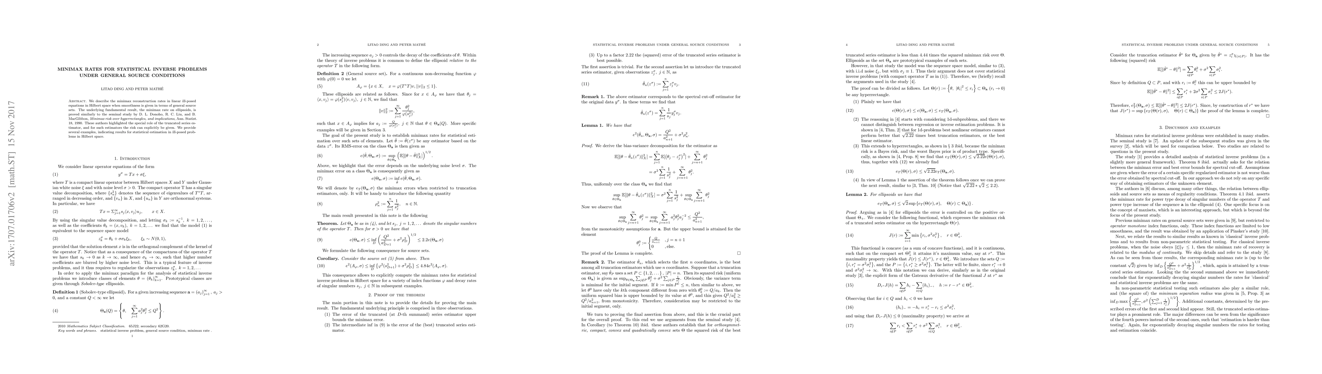 This paper investigates minimax reconstruction rates for linear ill-posed equations in Hilbert space, focusing on general source conditions. It establishes the minimax rate on ellipsoids, drawing on methods similar to Donoho, Liu, and MacGibbon's seminal work, and provides explicit risk expressions for truncated series estimators with several illustrative examples.