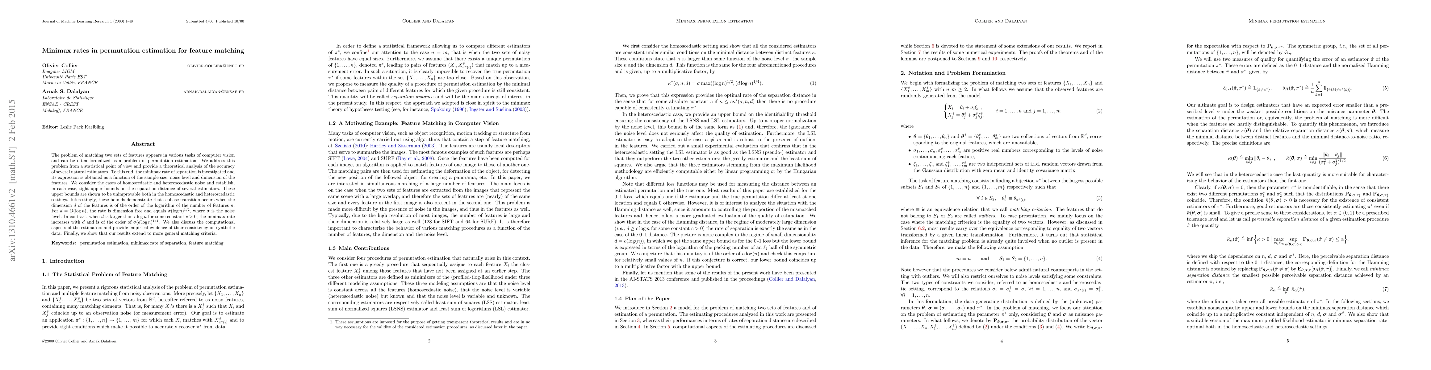 The problem of matching two sets of features appears in various tasks of computer vision and can be often formalized as a problem of permutation estimation. We address this problem from a statistical point of view and provide a theoretical analysis of the accuracy of several natural estimators. To this end, the minimax rate of separation is investigated and its expression is obtained as a function of the sample size, noise level and dimension. We consider the cases of homoscedastic and heteroscedastic noise and establish, in each case, tight upper bounds on the separation distance of several estimators. These upper bounds are shown to be unimprovable both in the homoscedastic and heteroscedastic settings. Interestingly, these bounds demonstrate that a phase transition occurs when the dimension $d$ of the features is of the order of the logarithm of the number of features $n$. For $d=O(\log n)$, the rate is dimension free and equals $\sigma (\log n)^{1/2}$, where $\sigma$ is the noise level. In contrast, when $d$ is larger than $c\log n$ for some constant $c>0$, the minimax rate increases with $d$ and is of the order $\sigma(d\log n)^{1/4}$. We also discuss the computational aspects of the estimators and provide empirical evidence of their consistency on synthetic data. Finally, we show that our results extend to more general matching criteria.