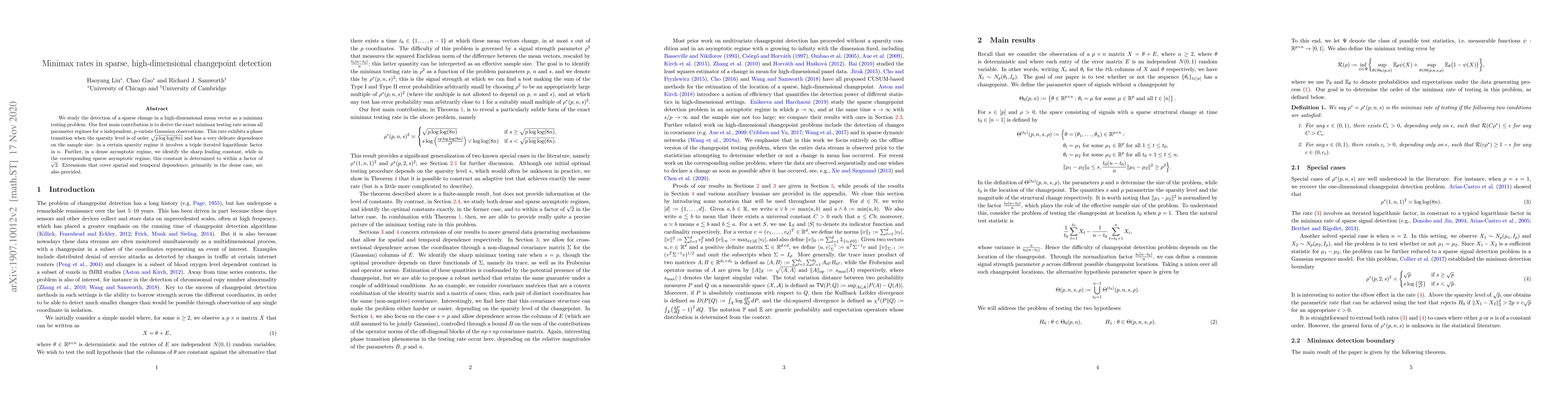 We study the detection of a sparse change in a high-dimensional mean vector as a minimax testing problem. Our first main contribution is to derive the exact minimax testing rate across all parameter regimes for $n$ independent, $p$-variate Gaussian observations. This rate exhibits a phase transition when the sparsity level is of order $\sqrt{p \log \log (8n)}$ and has a very delicate dependence on the sample size: in a certain sparsity regime it involves a triple iterated logarithmic factor in~$n$. Further, in a dense asymptotic regime, we identify the sharp leading constant, while in the corresponding sparse asymptotic regime, this constant is determined to within a factor of $\sqrt{2}$. Extensions that cover spatial and temporal dependence, primarily in the dense case, are also provided.