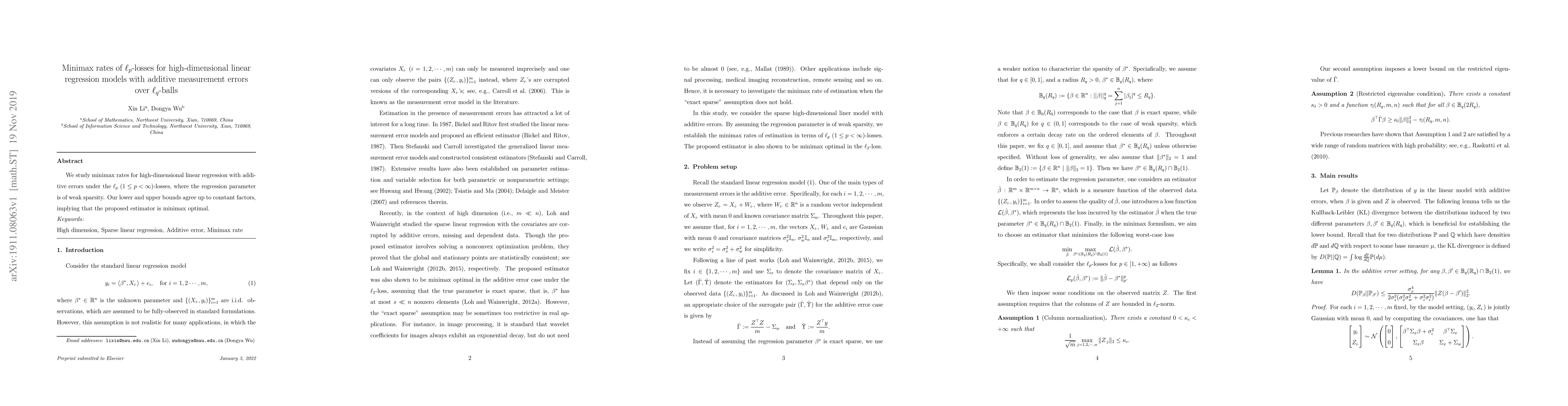 This paper investigates minimax rates for high-dimensional linear regression with additive measurement errors, focusing on $\ell_p$-losses. The study establishes that the proposed estimator achieves minimax optimality, with lower and upper bounds matching up to constant factors.