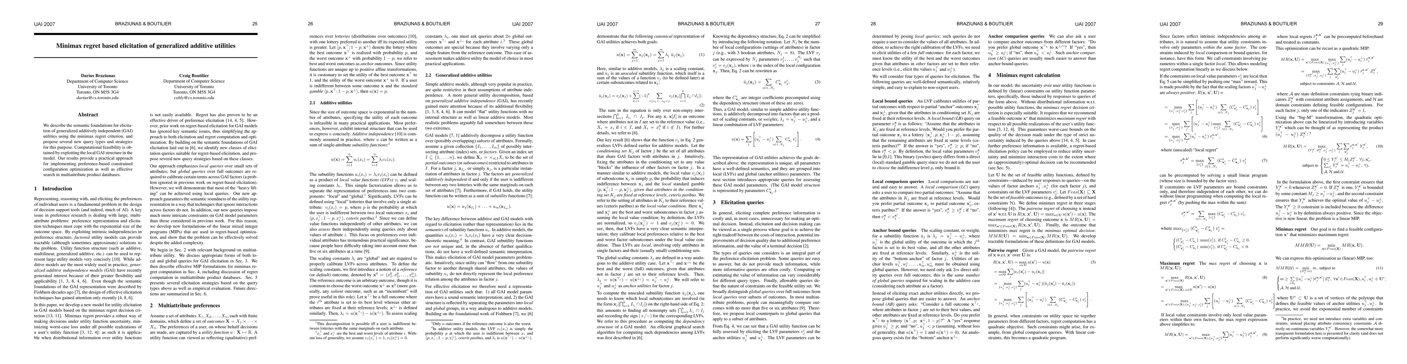 This paper introduces a method for eliciting generalized additively independent utilities based on the minimax regret criterion, proposing new query types and strategies. It leverages the local structure of the model to ensure computational feasibility, offering practical applications for preference-based optimization and search in multiattribute product databases.