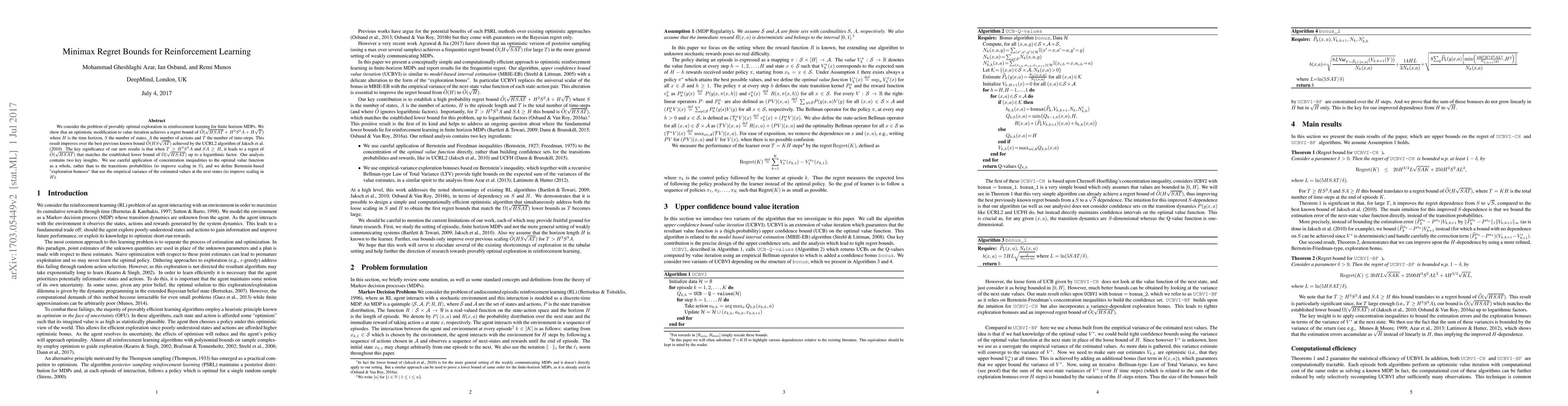 We consider the problem of provably optimal exploration in reinforcement learning for finite horizon MDPs. We show that an optimistic modification to value iteration achieves a regret bound of $\tilde{O}( \sqrt{HSAT} + H^2S^2A+H\sqrt{T})$ where $H$ is the time horizon, $S$ the number of states, $A$ the number of actions and $T$ the number of time-steps. This result improves over the best previous known bound $\tilde{O}(HS \sqrt{AT})$ achieved by the UCRL2 algorithm of Jaksch et al., 2010. The key significance of our new results is that when $T\geq H^3S^3A$ and $SA\geq H$, it leads to a regret of $\tilde{O}(\sqrt{HSAT})$ that matches the established lower bound of $\Omega(\sqrt{HSAT})$ up to a logarithmic factor. Our analysis contains two key insights. We use careful application of concentration inequalities to the optimal value function as a whole, rather than to the transitions probabilities (to improve scaling in $S$), and we define Bernstein-based "exploration bonuses" that use the empirical variance of the estimated values at the next states (to improve scaling in $H$).