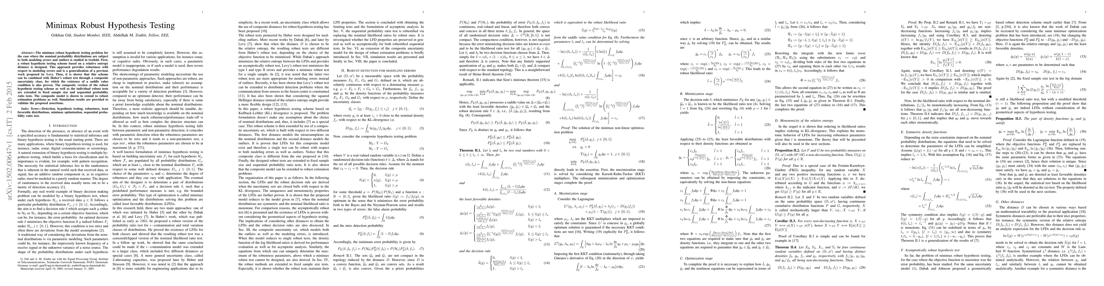 The minimax robust hypothesis testing problem for the case where the nominal probability distributions are subject to both modeling errors and outliers is studied in twofold. First, a robust hypothesis testing scheme based on a relative entropy distance is designed. This approach provides robustness with respect to modeling errors and is a generalization of a previous work proposed by Levy. Then, it is shown that this scheme can be combined with Huber's robust test through a composite uncertainty class, for which the existence of a saddle value condition is also proven. The composite version of the robust hypothesis testing scheme as well as the individual robust tests are extended to fixed sample size and sequential probability ratio tests. The composite model is shown to extend to robust estimation problems as well. Simulation results are provided to validate the proposed assertions.