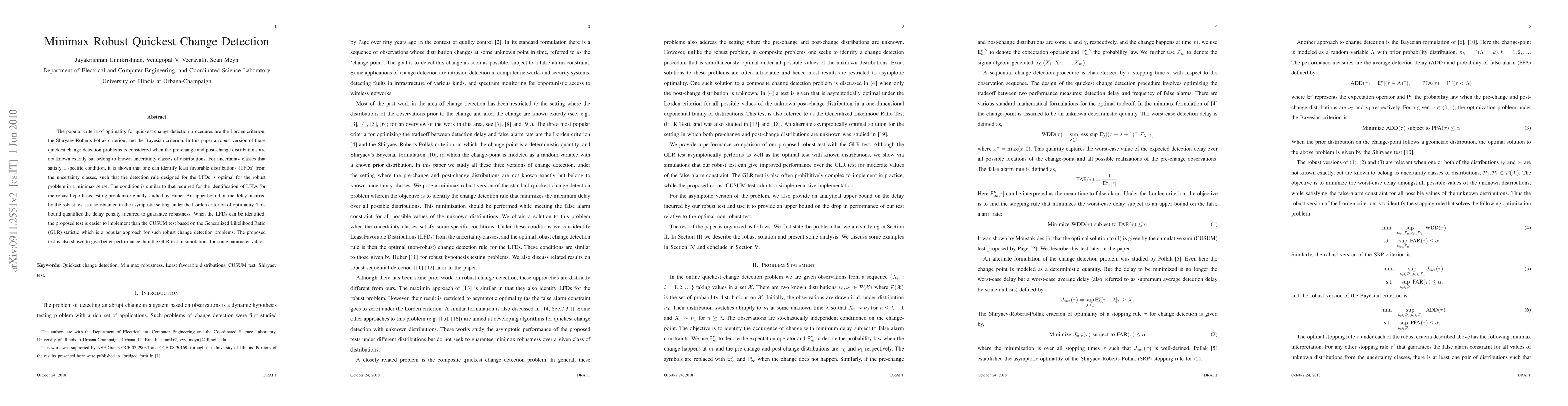 This paper develops a robust minimax quickest change detection method where pre-change and post-change distributions belong to known uncertainty classes. It identifies least favorable distributions to design optimal detection rules and compares performance with the GLR test, showing better results in some cases.