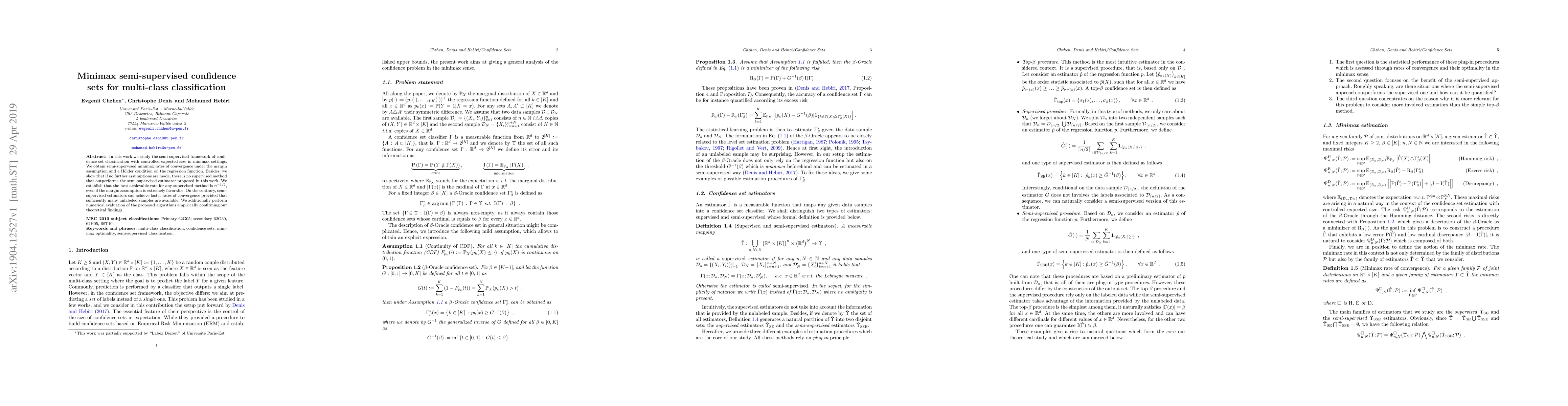 This paper investigates semi-supervised confidence sets for multi-class classification, demonstrating that semi-supervised estimators can achieve faster convergence rates than supervised methods, especially when many unlabeled samples are available. The study establishes theoretical bounds and confirms the findings through empirical evaluations.
