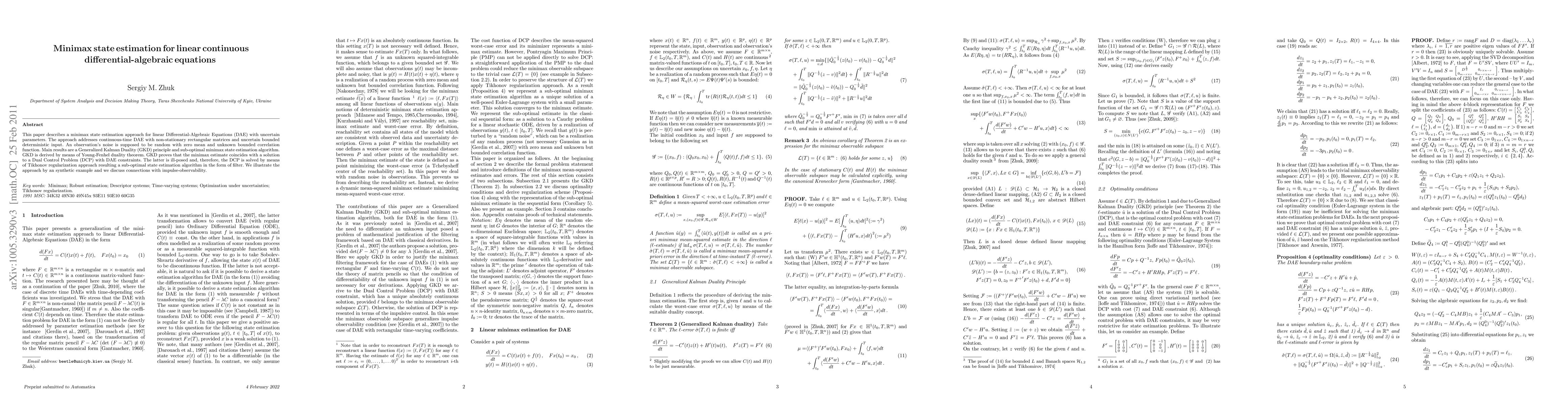 This paper describes a minimax state estimation approach for linear Differential-Algebraic Equations (DAE) with uncertain parameters. The approach addresses continuous-time DAE with non-stationary rectangular matrices and uncertain bounded deterministic input. An observation's noise is supposed to be random with zero mean and unknown bounded correlation function. Main results are a Generalized Kalman Duality (GKD) principle and sub-optimal minimax state estimation algorithm. GKD is derived by means of Young-Fenhel duality theorem. GKD proves that the minimax estimate coincides with a solution to a Dual Control Problem (DCP) with DAE constraints. The latter is ill-posed and, therefore, the DCP is solved by means of Tikhonov regularization approach resulting a sub-optimal state estimation algorithm in the form of filter. We illustrate the approach by an synthetic example and we discuss connections with impulse-observability.