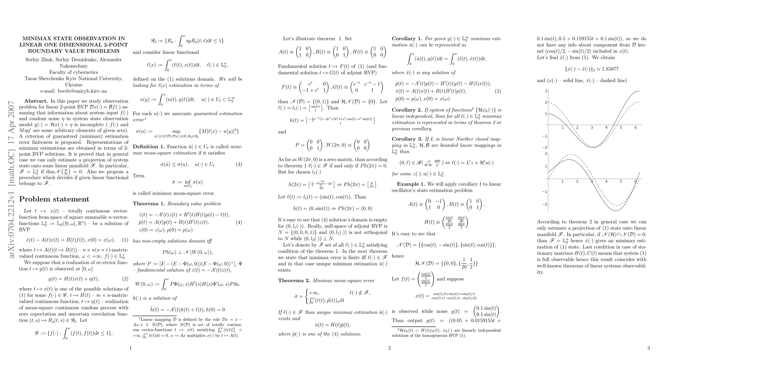 In this paper we study observation problem for linear 2-point BVP Dx=Bf assuming that information about system input f and random noise \eta in system state observation model y=Hx+\eta$ is incomplete (f and M\eta\eta' are some arbitrary elements of given sets). A criterion of guaranteed (minimax) estimation error finiteness is proposed. Representations of minimax estimations are obtained in terms of 2-point BVP solutions. It is proved that in general case we can only estimate a projection of system state onto some linear manifold $F$. In particular, $F=L_2$ if $dim N(D H) = 0$. Also we propose a procedure which decides if given linear functional belongs to $F$.