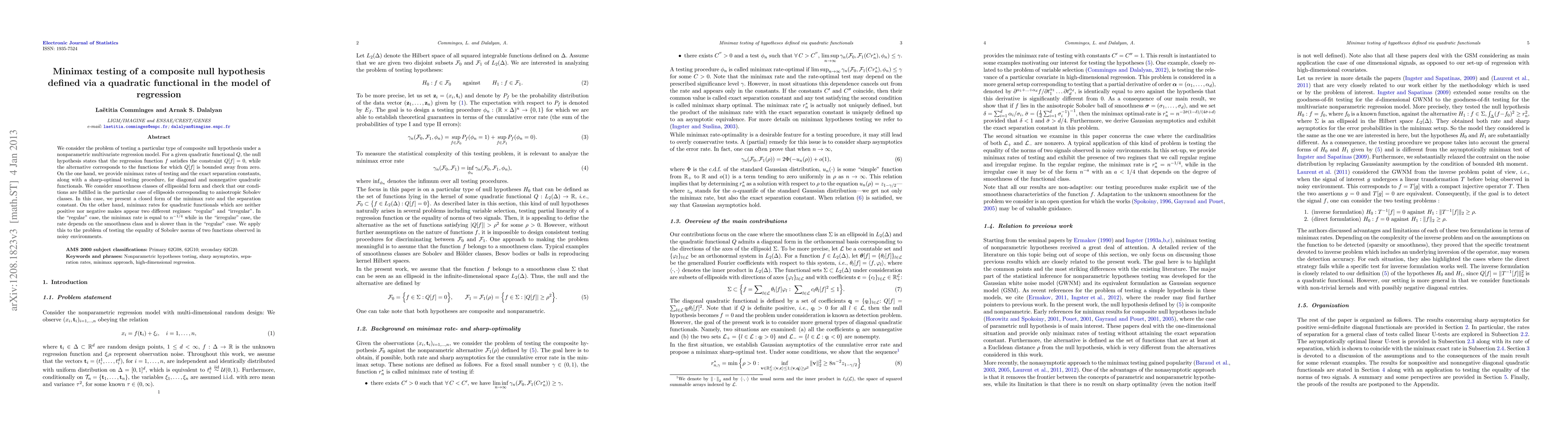 This paper explores the minimax testing of a composite null hypothesis in a nonparametric multivariate regression model where the null hypothesis is defined by a quadratic functional constraint. It provides optimal testing procedures and minimax rates for different types of quadratic functionals, distinguishing between "regular" and "irregular" cases based on the functional's properties.