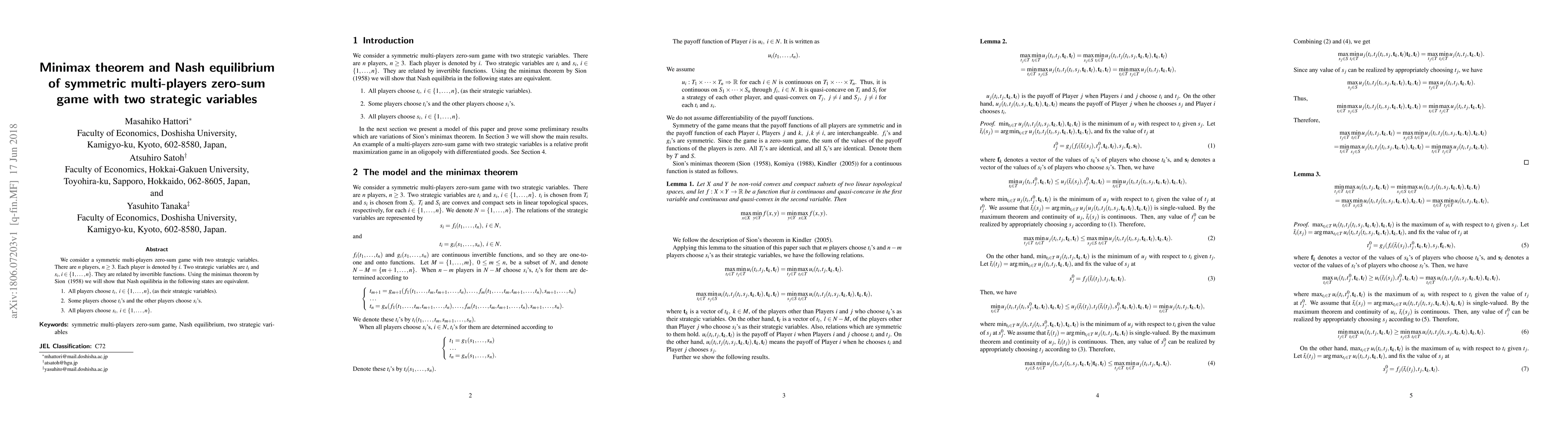 We consider a symmetric multi-players zero-sum game with two strategic variables. There are $n$ players, $n\geq 3$. Each player is denoted by $i$. Two strategic variables are $t_i$ and $s_i$, $i\in \{1, \dots, n\}$. They are related by invertible functions. Using the minimax theorem by \cite{sion} we will show that Nash equilibria in the following states are equivalent. 1. All players choose $t_i,\ i\in \{1, \dots, n\}$, (as their strategic variables). 2. Some players choose $t_i$'s and the other players choose $s_i$'s. 3. All players choose $s_i,\ i\in \{1, \dots, n\}$.