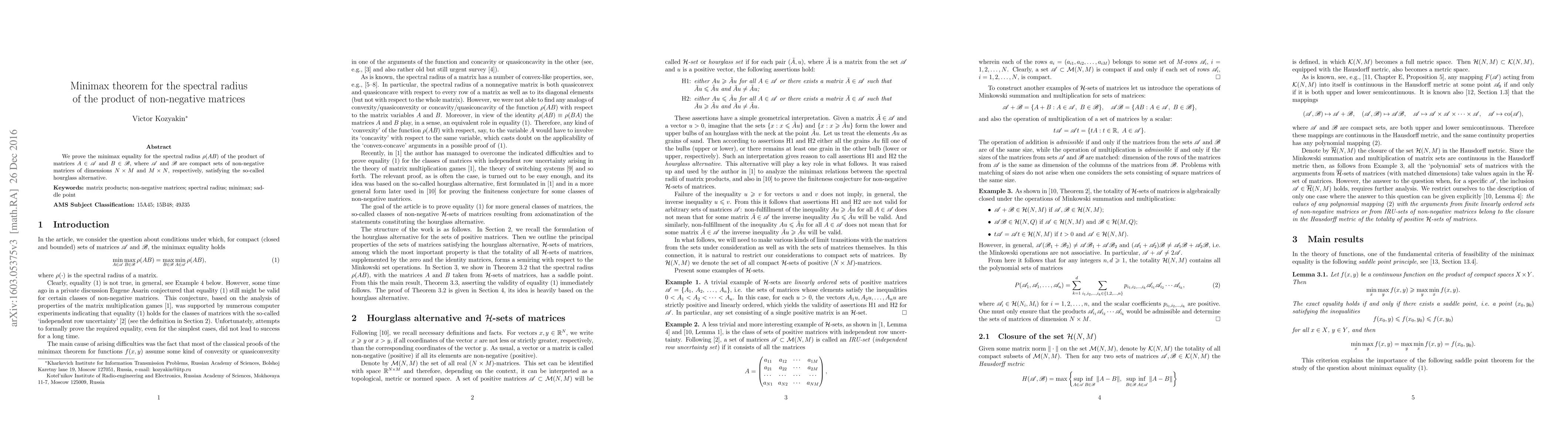 This paper proves the minimax equality for the spectral radius of the product of non-negative matrices $A$ and $B$, where $A$ and $B$ are from compact sets $\mathcal{A}$ and $\mathcal{B}$ respectively, under the condition of the hourglass alternative.