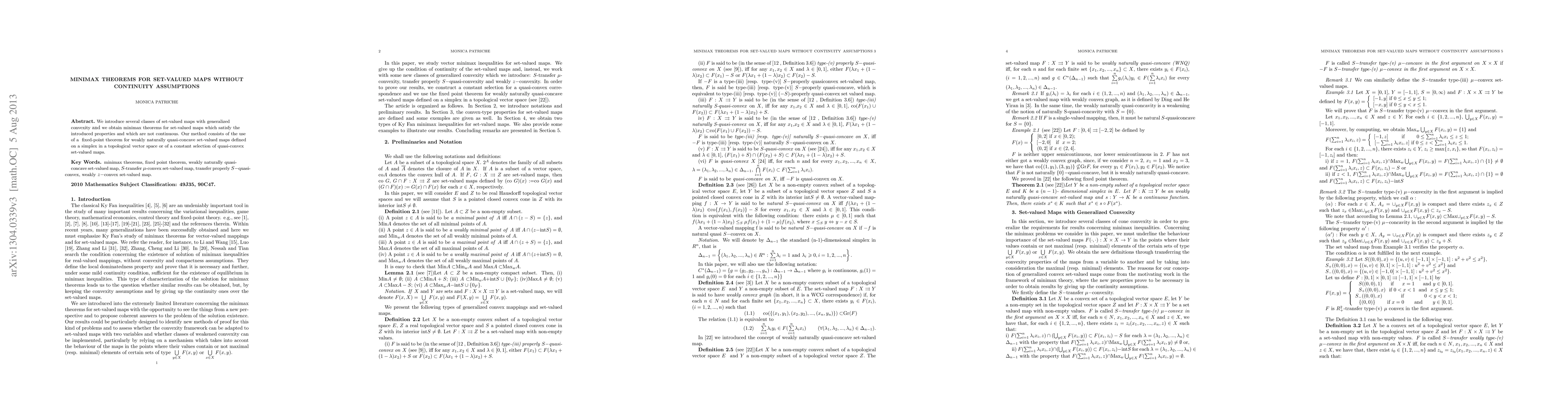This paper presents minimax theorems for set-valued maps lacking continuity, introducing classes of generalized convexity and utilizing a fixed point theorem for weakly naturally quasi-concave maps on a topological vector space's simplex.
