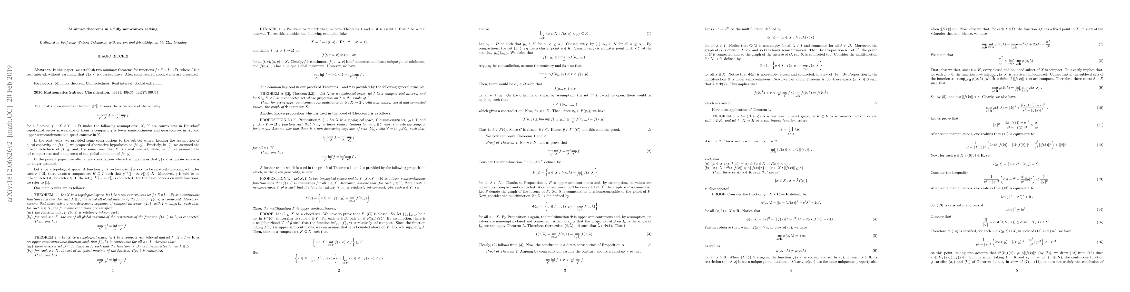 This paper establishes two minimax theorems for functions $f:X\times I \to \mathbb{R}$ without requiring quasi-concavity, and presents related applications in a fully non-convex setting.