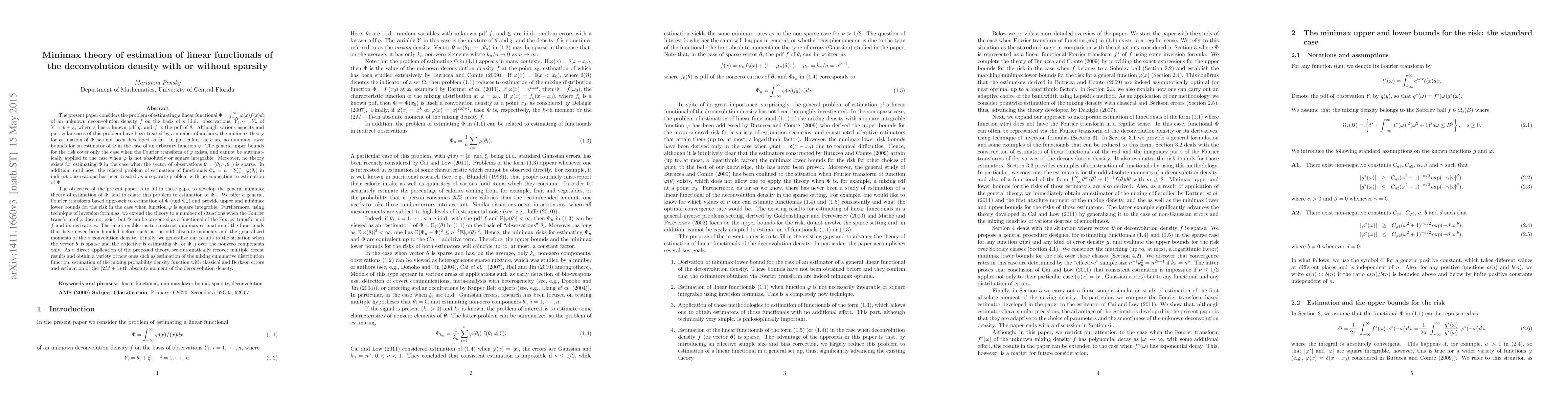 The present paper considers a problem of estimating a linear functional $\Phi=\int_{-\infty}^\infty \varphi(x) f(x)dx$ of an unknown deconvolution density $f$ on the basis of i.i.d. observations $Y_i = \theta_i + \xi_i$ where $\xi_i$ has a known pdf $g$ and $f$ is the pdf of $\theta_i$. Although various aspects and particular cases of this problem have been treated by a number of authors, there are still many gaps. In particular, there are no minimax lower bounds for an estimator of $\Phi$ for an arbitrary function $\varphi$. The general upper risk bounds cover only the case when the Fourier transform of $\varphi$ exists. Moreover, no theory exists for estimating $\Phi$ when vector of observations is sparse. In addition, until now, the related problem of estimation of functionals $\Phi_n = n^{-1} \sum_{i=1}^n \varphi(\theta_i)$ in indirect observations have been treated as a separate problem with no connection to estimation of $\Phi$. The objective of the present paper is to fill in the gaps and develop the general minimax theory of estimation of $\Phi$ and $\Phi_n$. We offer a general approach to estimation of $\Phi$ (and $\Phi_n$) and provide the upper and the minimax lower risk bounds in the case when function $\varphi$ is square integrable. Furthermore, we extend the theory to the case when Fourier transform of $\varphi$ does not exist and $\Phi$ can be presented as a linear functional of the Fourier transform of $f$ and its derivatives. Finally, we generalize our results to handle the situation when vector $\theta$ is sparse. As a direct application of the proposed theory, we obtain multiple new results and automatically recover existing ones for a variety of problems such as estimation of the $(2M+1)$-th absolute moment or a generalized moment of the deconvolution density, estimation of the mixing cdf or estimation of the mixing pdf with classical and Berkson errors.