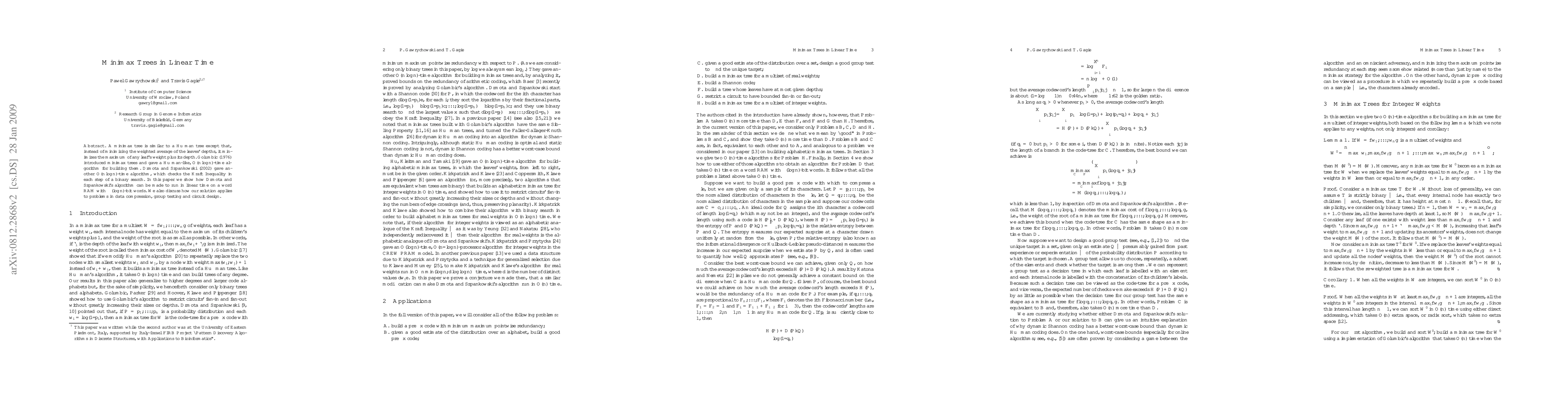 A new algorithm for building minimax trees in linear time has been developed, improving upon existing $ extit{O}( ext{n log n})$-time algorithms, enabling applications in data compression, group testing, and circuit design.