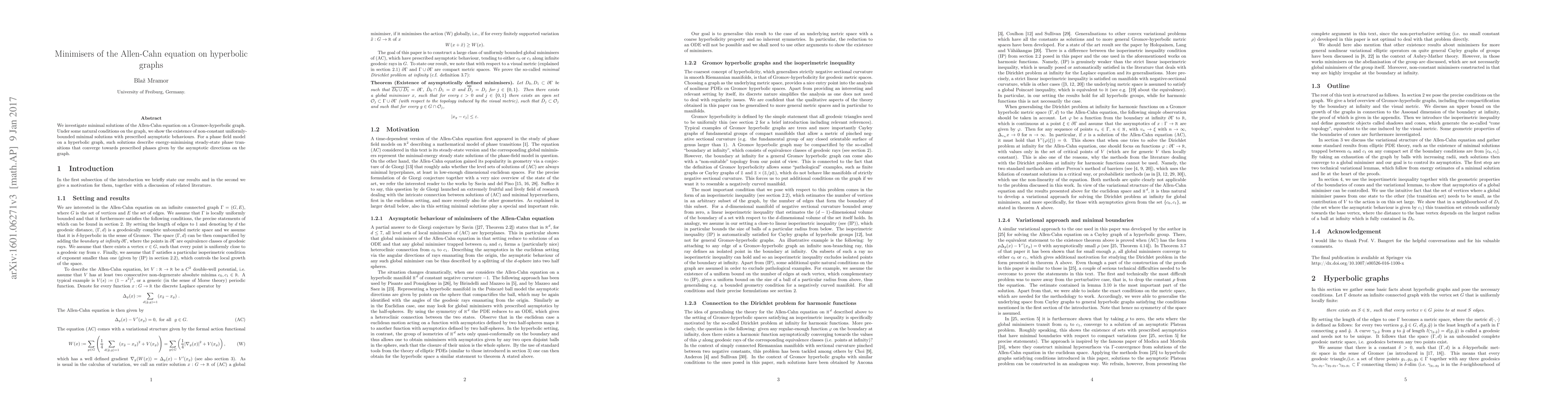 This paper explores minimal solutions of the Allen-Cahn equation on Gromov-hyperbolic graphs, demonstrating the existence of non-constant, uniformly-bounded solutions with prescribed asymptotic behaviours, which model energy-minimising steady-state phase transitions.