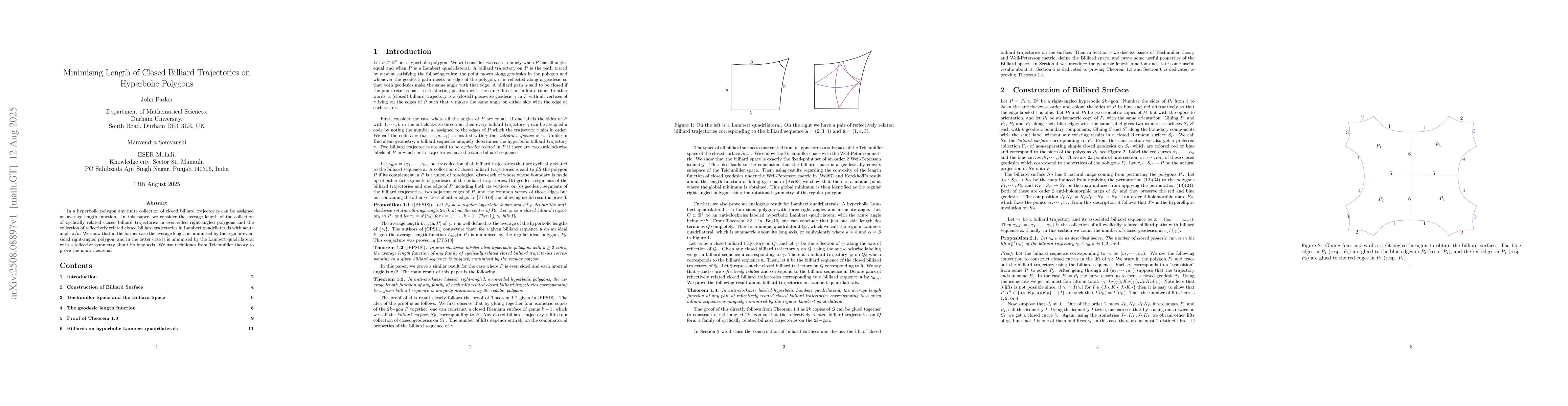 In a hyperbolic polygon any finite collection of closed billiard trajectories can be assigned an average length function. In this paper, we consider the average length of the collection of cyclically related closed billiard trajectories in even-sided right-angled polygons and the collection of reflectively related closed billiard trajectories in Lambert quadrilaterals with acute angle $\pi/k$. We show that in the former case the average length is minimised by the regular evensided right-angled polygon, and in the latter case it is minimised by the Lambert quadrilateral with a reflective symmetry about its long axis. We use techniques from Teichmueller theory to prove the main theorems.