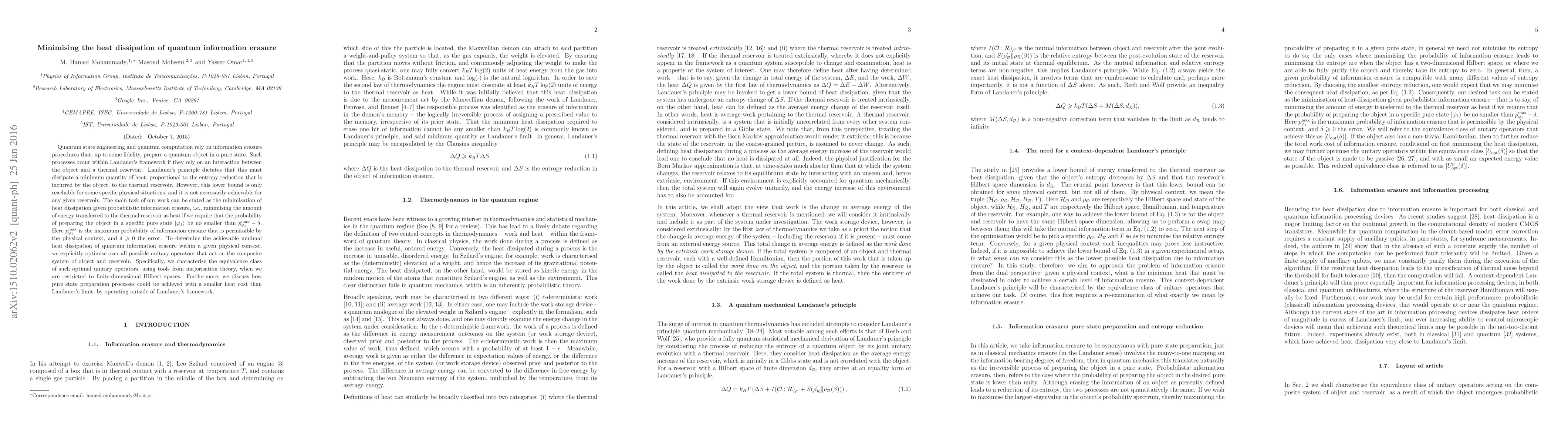 Quantum state engineering and quantum computation rely on information erasure procedures that, up to some fidelity, prepare a quantum object in a pure state. Such processes occur within Landauer's framework if they rely on an interaction between the object and a thermal reservoir. Landauer's principle dictates that this must dissipate a minimum quantity of heat, proportional to the entropy reduction that is incurred by the object, to the thermal reservoir. However, this lower bound is only reachable for some specific physical situations, and it is not necessarily achievable for any given reservoir. The main task of our work can be stated as the minimisation of heat dissipation given probabilistic information erasure, i.e., minimising the amount of energy transferred to the thermal reservoir as heat if we require that the probability of preparing the object in a specific pure state $|\varphi_1\rangle$ be no smaller than $p_{\varphi_1}^{\max}-\delta$. Here $p_{\varphi_1}^{\max}$ is the maximum probability of information erasure that is permissible by the physical context, and $\delta\geqslant 0$ the error. To determine the achievable minimal heat dissipation of quantum information erasure within a given physical context, we explicitly optimise over all possible unitary operators that act on the composite system of object and reservoir. Specifically, we characterise the equivalence class of such optimal unitary operators, using tools from majorisation theory, when we are restricted to finite-dimensional Hilbert spaces. Furthermore, we discuss how pure state preparation processes could be achieved with a smaller heat cost than Landauer's limit, by operating outside of Landauer's framework.