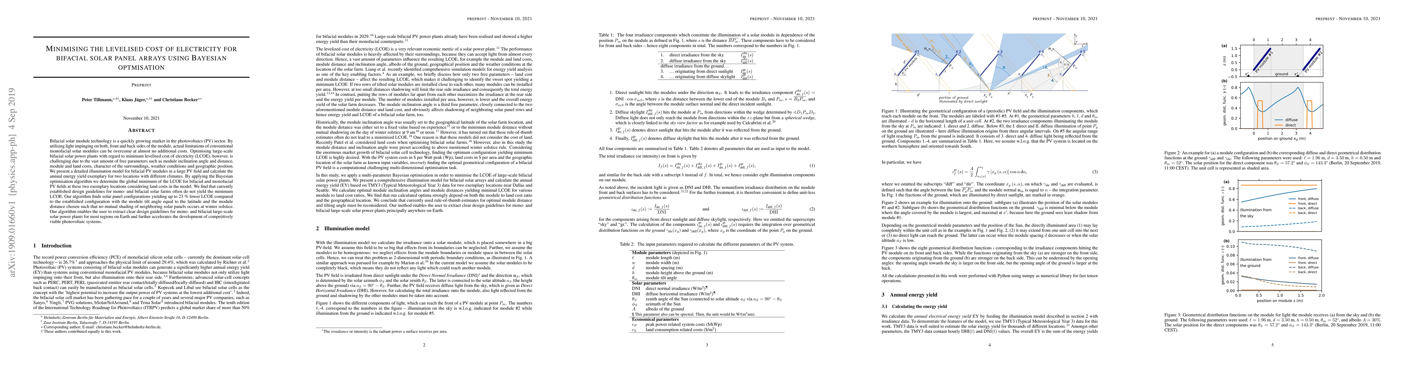 This paper presents a Bayesian optimisation algorithm to minimise the levelised cost of electricity (LCOE) for bifacial solar panel arrays, finding configurations that yield up to 23% lower LCOE compared to conventional designs. The study demonstrates the potential of bifacial solar technology to outperform traditional monofacial systems with optimised configurations.