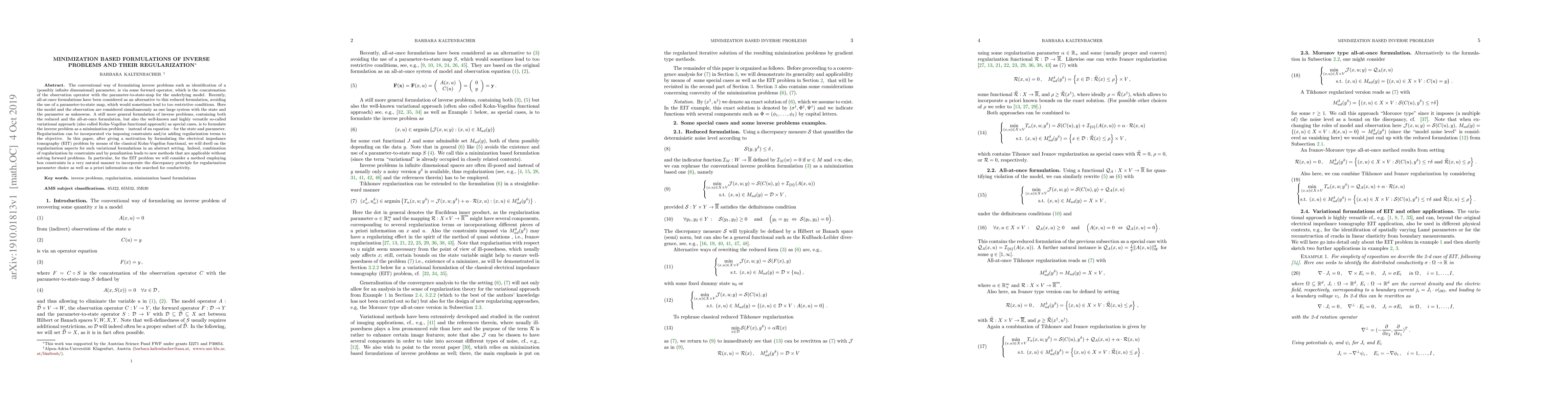 This paper explores minimization-based formulations for inverse problems, including electrical impedance tomography (EIT), and discusses regularization methods that incorporate constraints and penalization without requiring forward problem solutions. The focus is on the variational approach and its regularization aspects in an abstract setting.