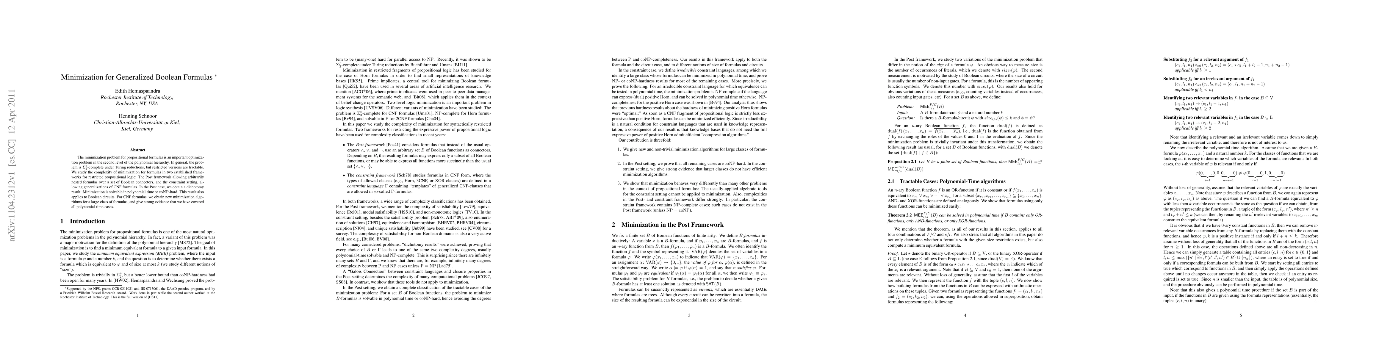 This paper explores the complexity of minimizing generalized Boolean formulas within two frameworks: the Post framework and the constraint setting. It finds that minimization in the Post framework is either polynomial-time solvable or coNP-hard, while new algorithms for minimizing a wide range of CNF formulas are presented.