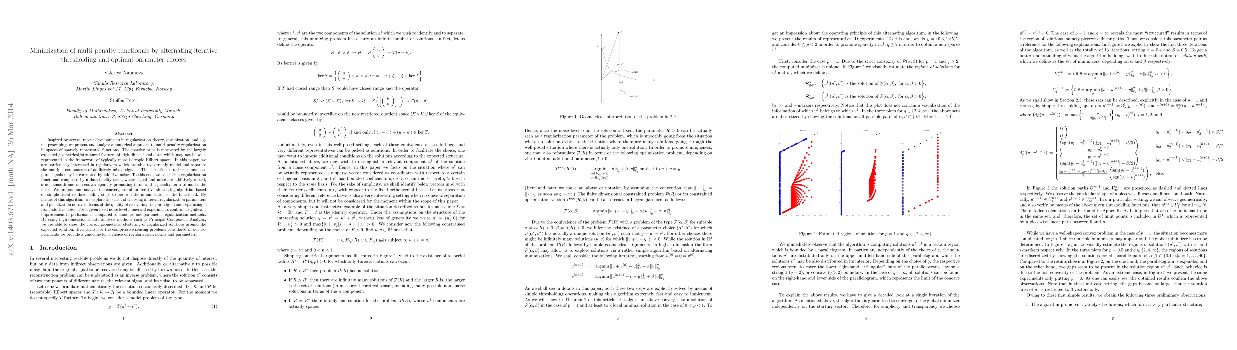 This paper proposes an iterative thresholding algorithm for minimizing multi-penalty functionals in sparse signal processing, focusing on separating mixed signals and noise. The method demonstrates improved performance over standard regularization techniques, validated through high-dimensional data analysis and compressive sensing experiments.