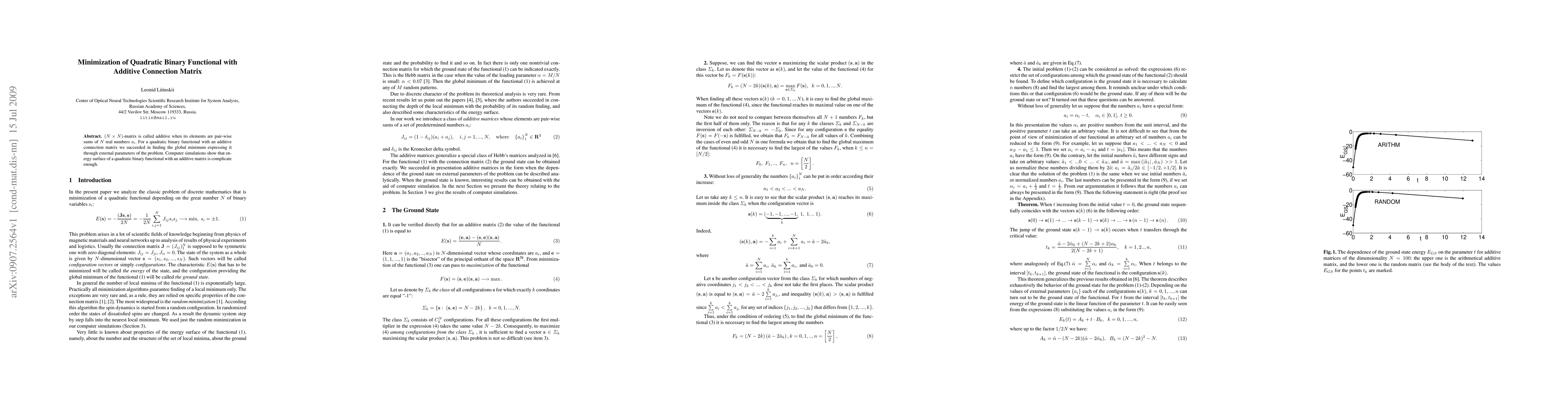 (NxN)-matrix is called additive when its elements are pair-wise sums of N real numbers. For a quadratic binary functional with an additive connection matrix we succeeded in finding the global minimum expressing it through external parameters of the problem. Computer simulations show that energy surface of a quadratic binary functional with an additive matrix is complicate enough.