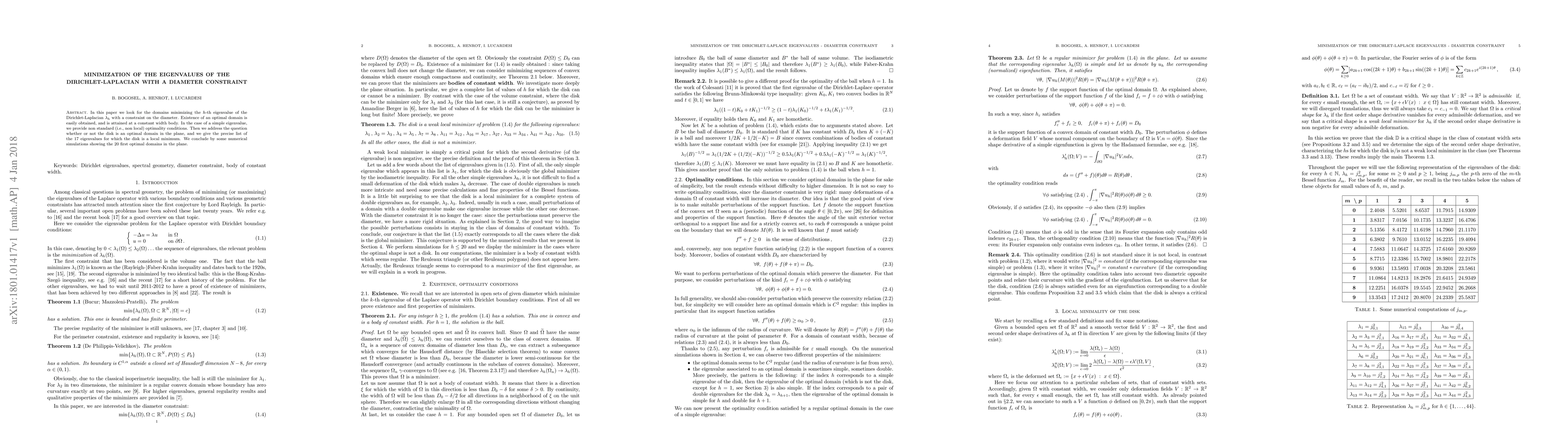 This paper finds that a constant-width body minimizes the h-th eigenvalue of the Dirichlet-Laplacian with a diameter constraint, with 17 specific eigenvalues where the disk is a local minimum.
