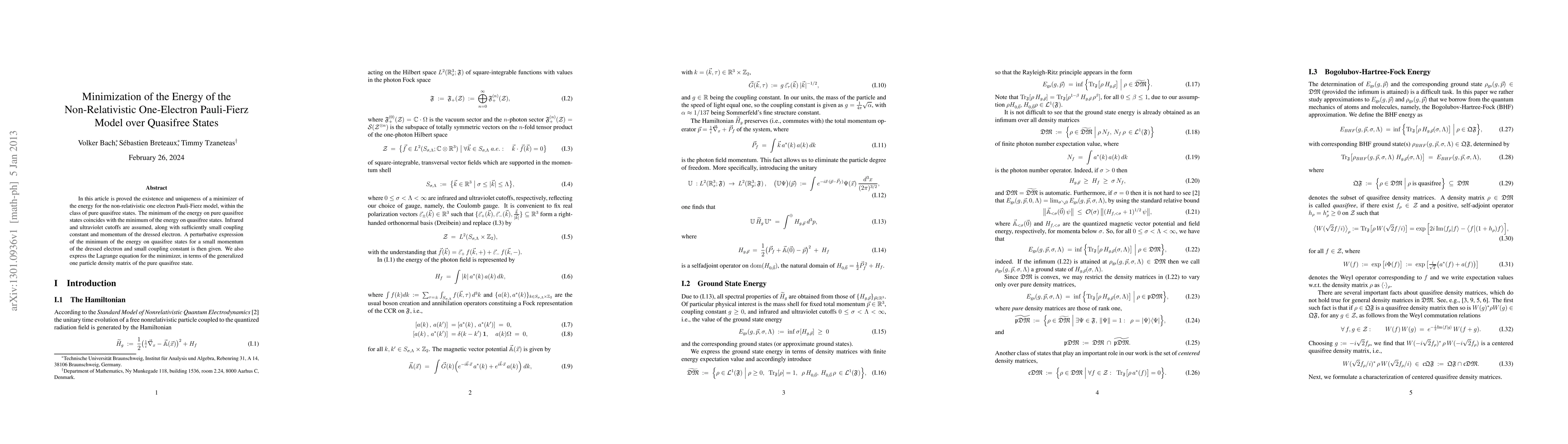 In this article is proved the existence and uniqueness of a minimizer of the energy for the non-relativistic one electron Pauli-Fierz model, within the class of pure quasifree states. The minimum of the energy on pure quasifree states coincides with the minimum of the energy on quasifree states. Infrared and ultraviolet cutoffs are assumed, along with sufficiently small coupling constant and momentum of the dressed electron. A perturbative expression of the minimum of the energy on quasifree states for a small momentum of the dressed electron and small coupling constant is then given. We also express the Lagrange equation for the minimizer, in terms of the generalized one particle density matrix of the pure quasifree state.