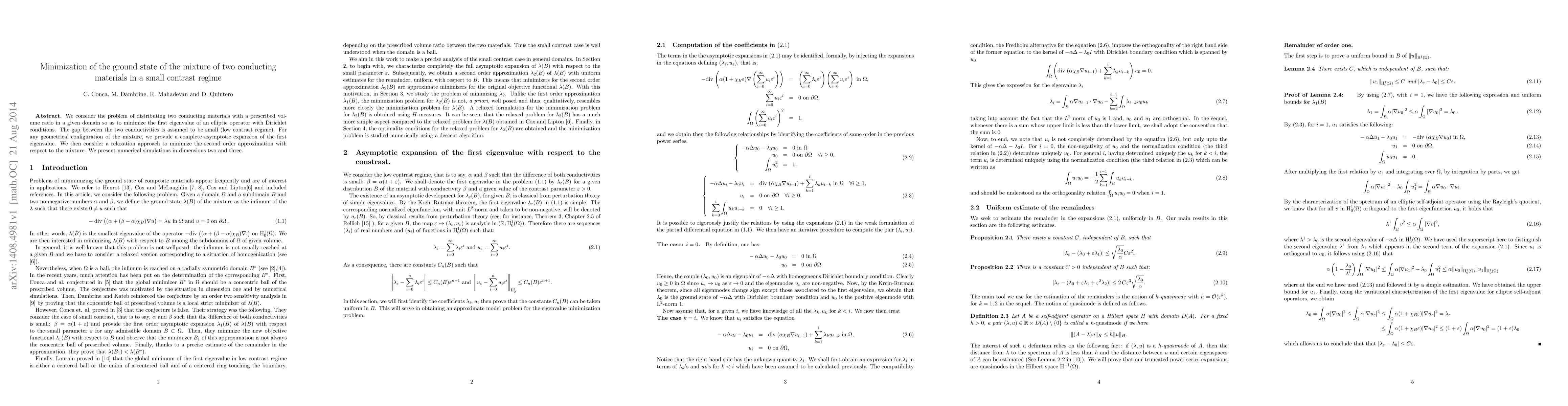This paper studies the optimization of the distribution of two conducting materials with a fixed volume ratio to minimize the first eigenvalue of an elliptic operator under Dirichlet conditions, focusing on a low contrast regime. The authors provide an asymptotic expansion of the first eigenvalue and employ a relaxation approach to minimize the second-order approximation, supported by numerical simulations in two and three dimensions.