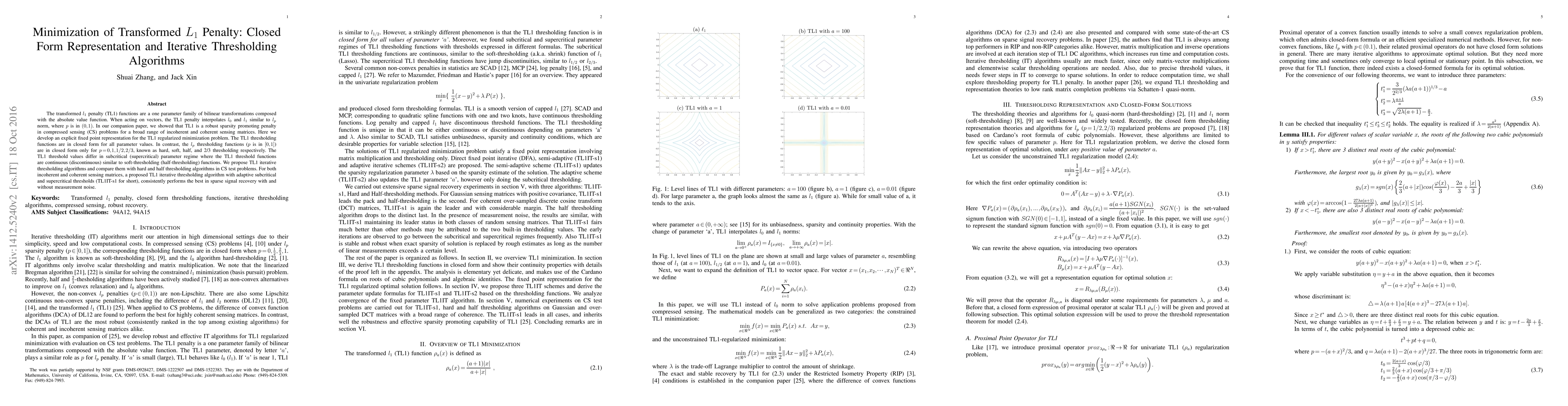 This paper develops an explicit fixed point representation for the transformed $L_1$ (TL1) penalty regularized minimization problem, providing closed form TL1 thresholding functions. The proposed TL1 iterative thresholding algorithms outperform hard and half thresholding in compressed sensing problems, especially with adaptive thresholds for both incoherent and coherent sensing matrices.