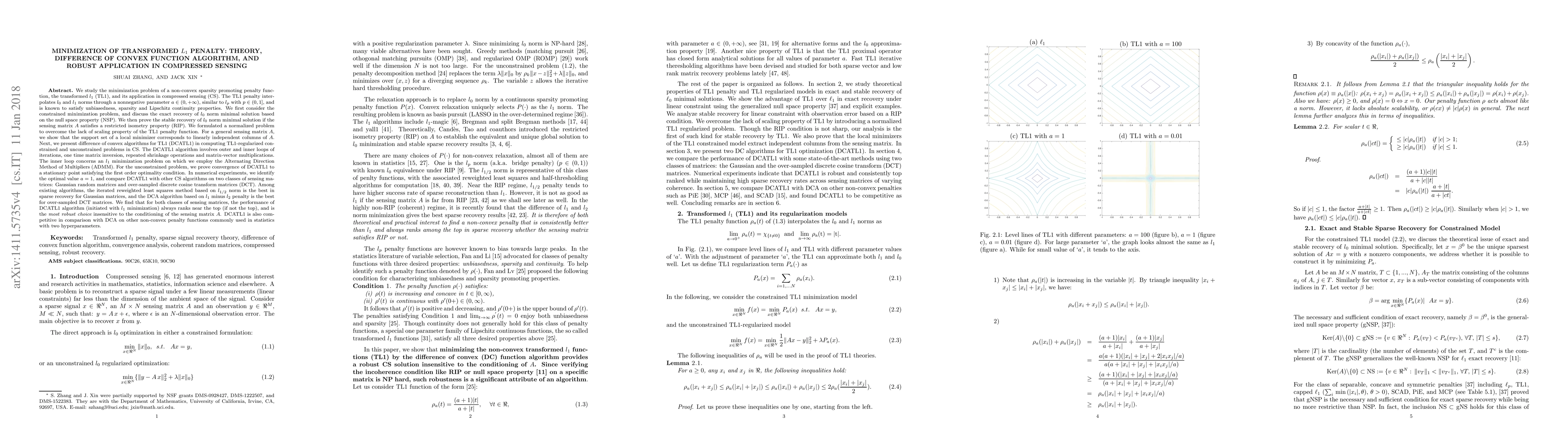 This paper explores the minimization of a non-convex transformed $L_1$ (TL1) penalty function for sparse signal recovery in compressed sensing. It presents a difference of convex function algorithm (DCATL1) for solving TL1-regularized problems and demonstrates its robustness and competitive performance against other compressed sensing algorithms.