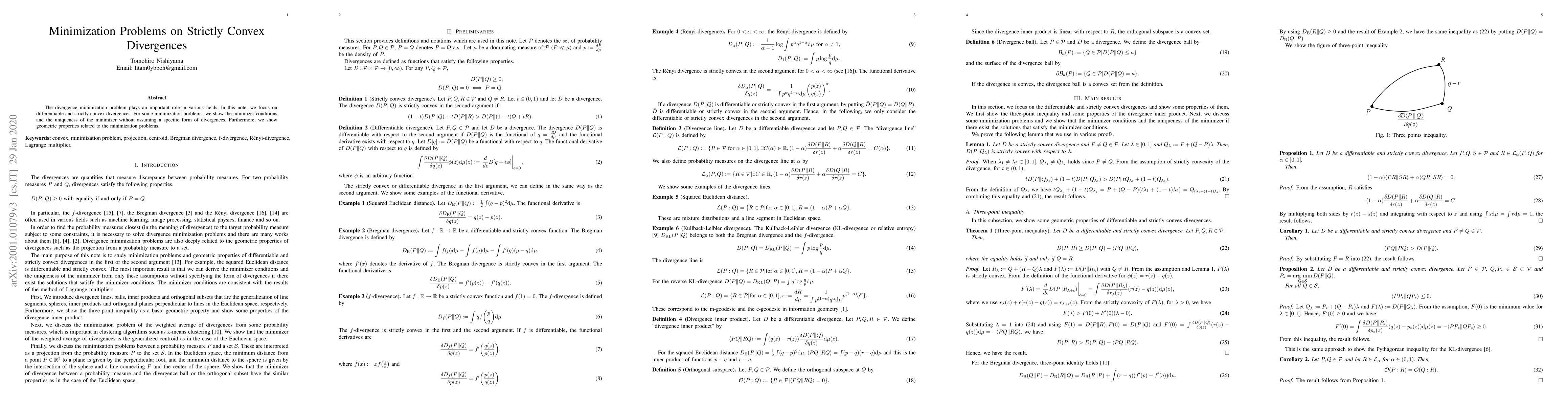 This paper explores the minimization problems associated with differentiable and strictly convex divergences, demonstrating conditions for minimizers and their uniqueness without requiring a specific divergence form, and highlighting related geometric properties.