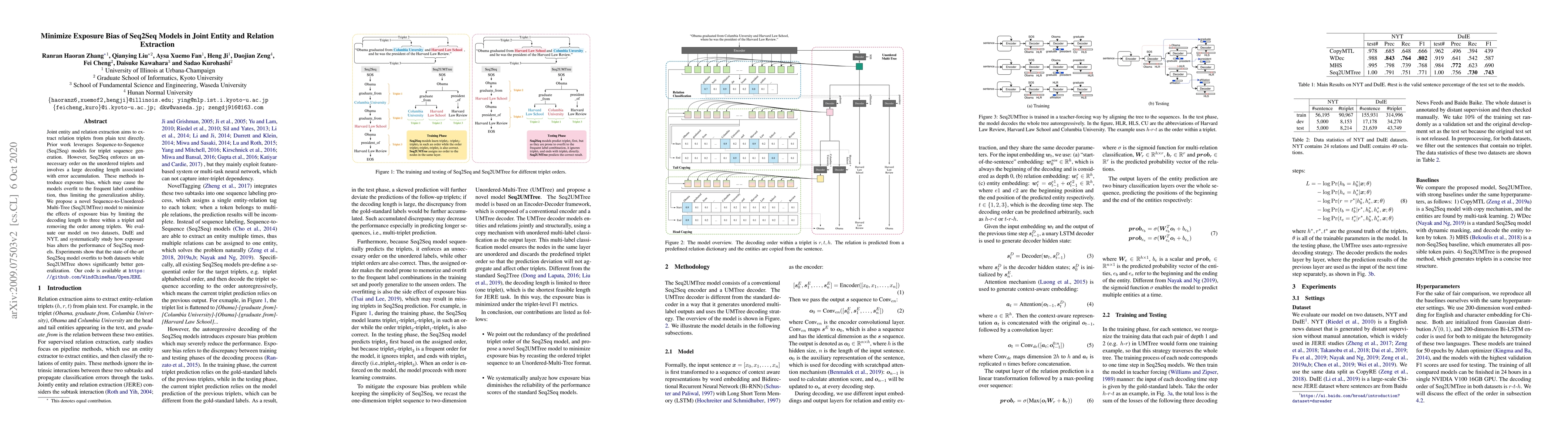 Joint entity and relation extraction aims to extract relation triplets from plain text directly. Prior work leverages Sequence-to-Sequence (Seq2Seq) models for triplet sequence generation. However, Seq2Seq enforces an unnecessary order on the unordered triplets and involves a large decoding length associated with error accumulation. These introduce exposure bias, which may cause the models overfit to the frequent label combination, thus deteriorating the generalization. We propose a novel Sequence-to-Unordered-Multi-Tree (Seq2UMTree) model to minimize the effects of exposure bias by limiting the decoding length to three within a triplet and removing the order among triplets. We evaluate our model on two datasets, DuIE and NYT, and systematically study how exposure bias alters the performance of Seq2Seq models. Experiments show that the state-of-the-art Seq2Seq model overfits to both datasets while Seq2UMTree shows significantly better generalization. Our code is available at https://github.com/WindChimeRan/OpenJERE .