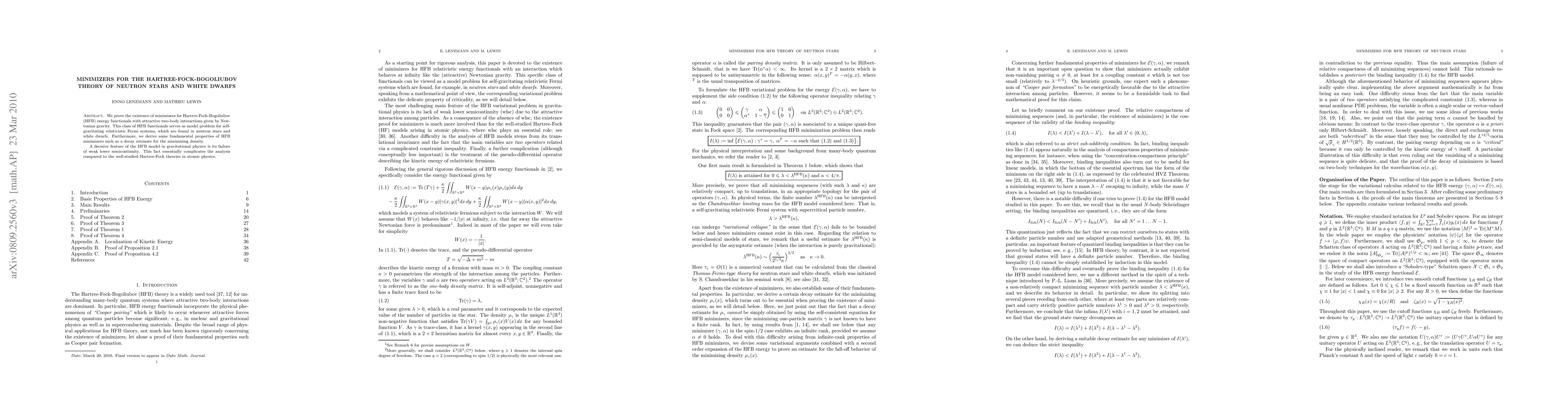 This paper proves the existence of minimizers for Hartree-Fock-Bogoliubov energy functionals in self-gravitating relativistic Fermi systems, such as neutron stars and white dwarfs, despite the failure of weak lower semicontinuity. It also derives a decay estimate for the minimizing density.