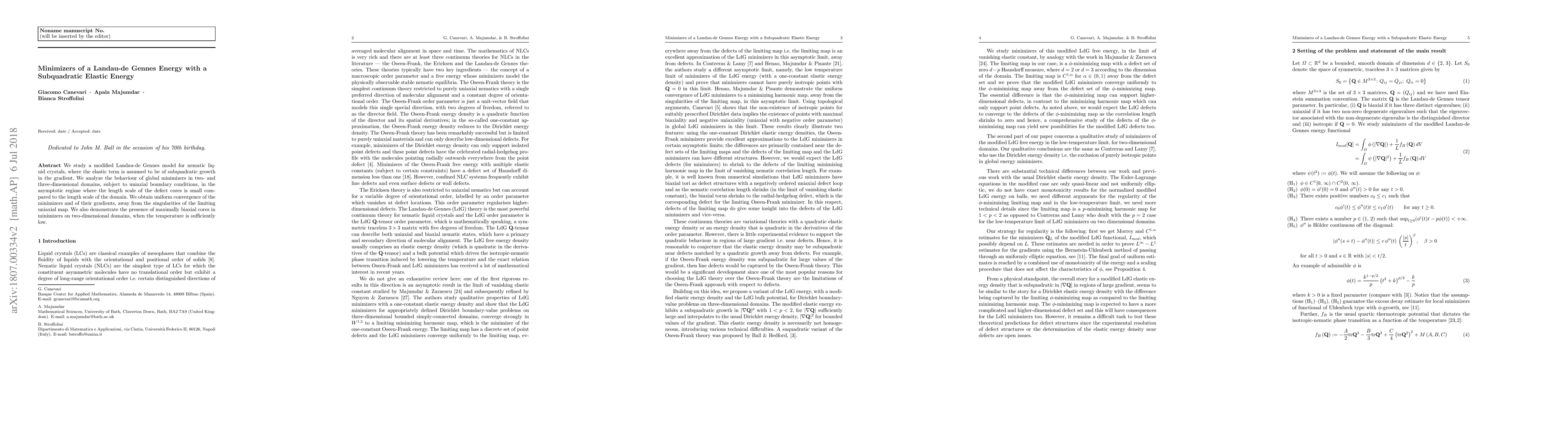 This paper investigates a modified Landau-de Gennes model for nematic liquid crystals with a subquadratic elastic energy term. It analyzes the behavior of global minimizers in two- and three-dimensional domains, showing uniform convergence of minimizers and their gradients away from singularities, and identifies biaxial cores in two-dimensional minimizers at low temperatures.