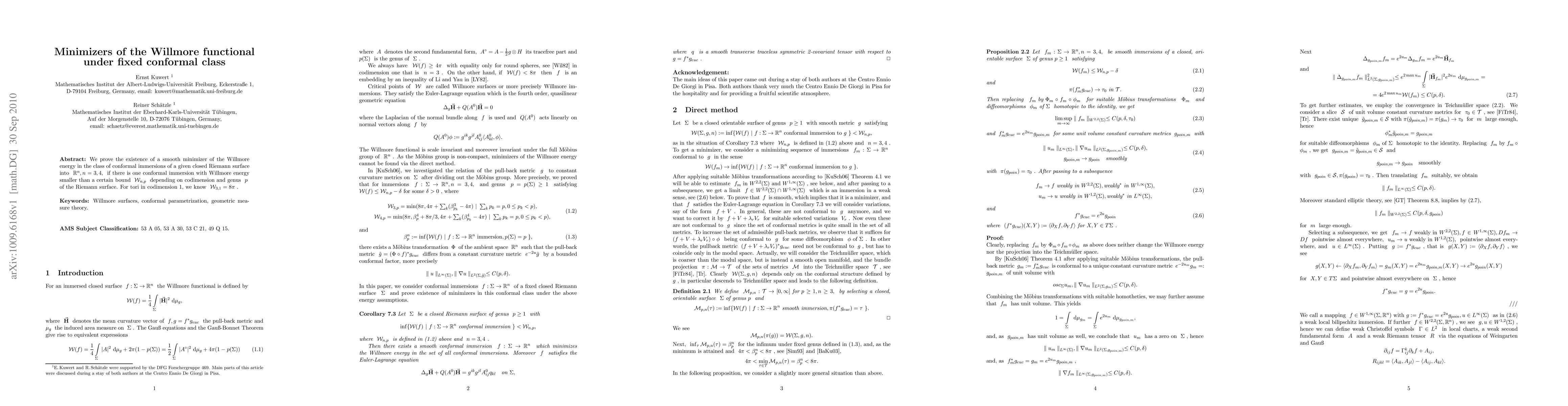 This paper proves the existence of smooth minimizers for the Willmore functional among conformal immersions of closed genus p surfaces into R^n for n=3,4, provided the infimum is below a bound ${\cal W}(n,p)$. The specific case for tori in R^3 is shown to have ${\cal W}(3,1) = 8\pi$.