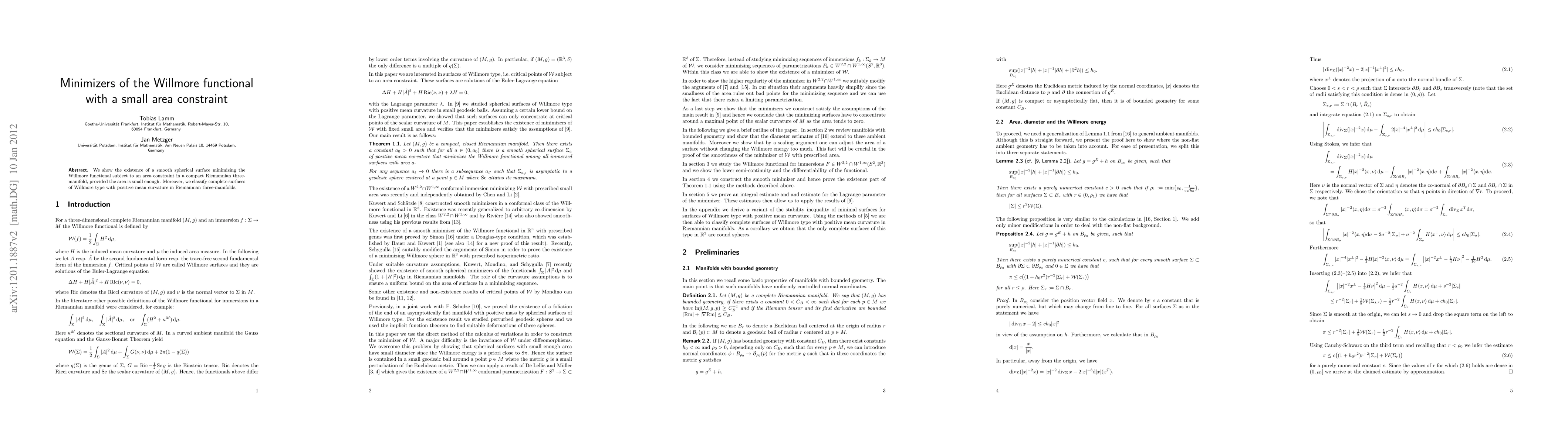 This paper demonstrates the existence of smooth spherical surfaces minimizing the Willmore functional under a small area constraint in compact Riemannian three-manifolds. Additionally, it classifies complete surfaces of Willmore type with positive mean curvature in such manifolds.