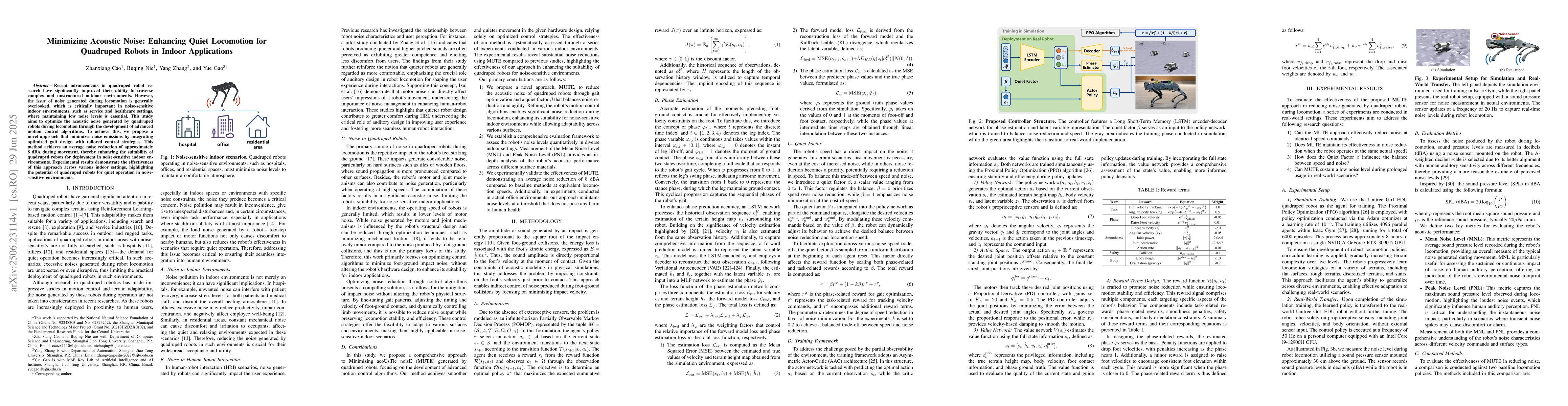 Recent advancements in quadruped robot research have significantly improved their ability to traverse complex and unstructured outdoor environments. However, the issue of noise generated during locomotion is generally overlooked, which is critically important in noise-sensitive indoor environments, such as service and healthcare settings, where maintaining low noise levels is essential. This study aims to optimize the acoustic noise generated by quadruped robots during locomotion through the development of advanced motion control algorithms. To achieve this, we propose a novel approach that minimizes noise emissions by integrating optimized gait design with tailored control strategies. This method achieves an average noise reduction of approximately 8 dBA during movement, thereby enhancing the suitability of quadruped robots for deployment in noise-sensitive indoor environments. Experimental results demonstrate the effectiveness of this approach across various indoor settings, highlighting the potential of quadruped robots for quiet operation in noise-sensitive environments.