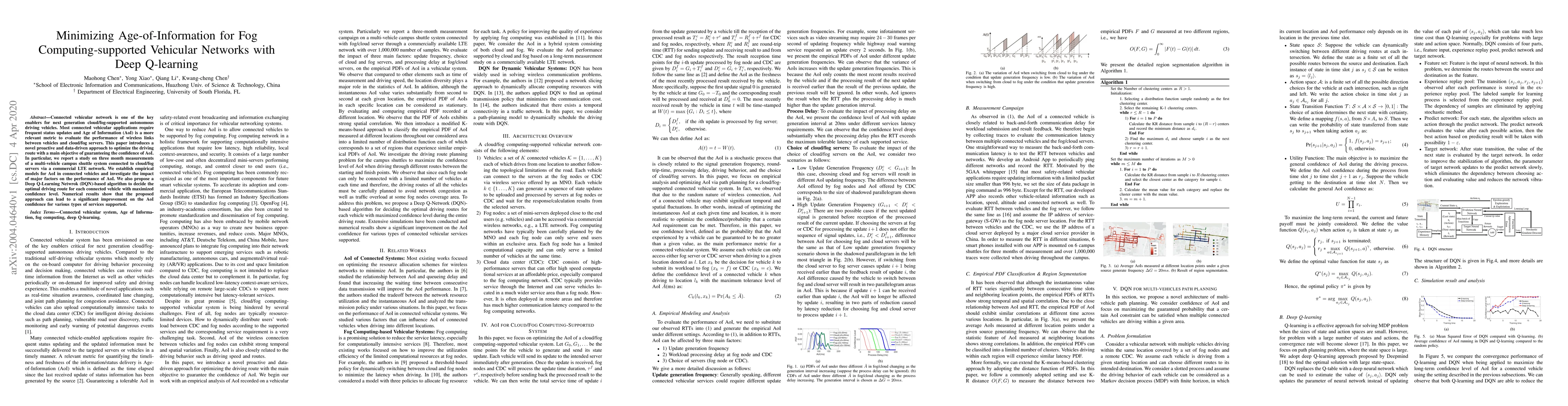 This paper proposes a Deep Q-Learning Network (DQN)-based algorithm to optimize driving routes in fog computing-supported vehicular networks, aiming to minimize the Age of Information (AoI) for improved performance. The study demonstrates significant improvements in AoI confidence through empirical models and three-month measurements of a campus shuttle system.