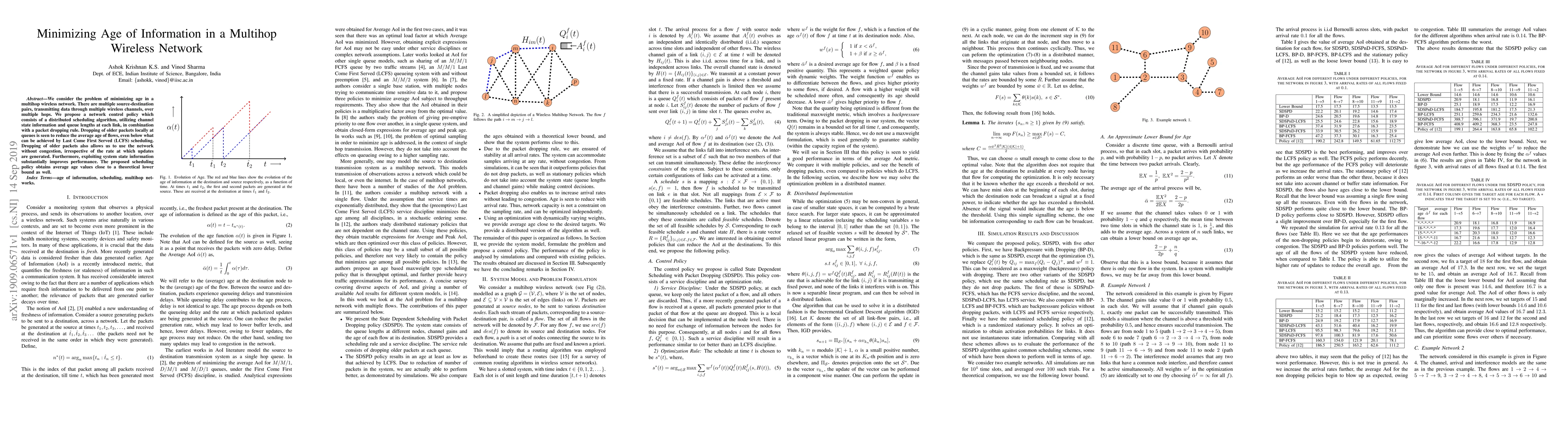 This paper proposes a distributed scheduling algorithm for minimizing age in multihop wireless networks, utilizing channel state information and queue lengths. The algorithm includes a packet dropping rule that prioritizes fresher packets, reducing average age below LCFS scheduling and maintaining network efficiency without congestion.