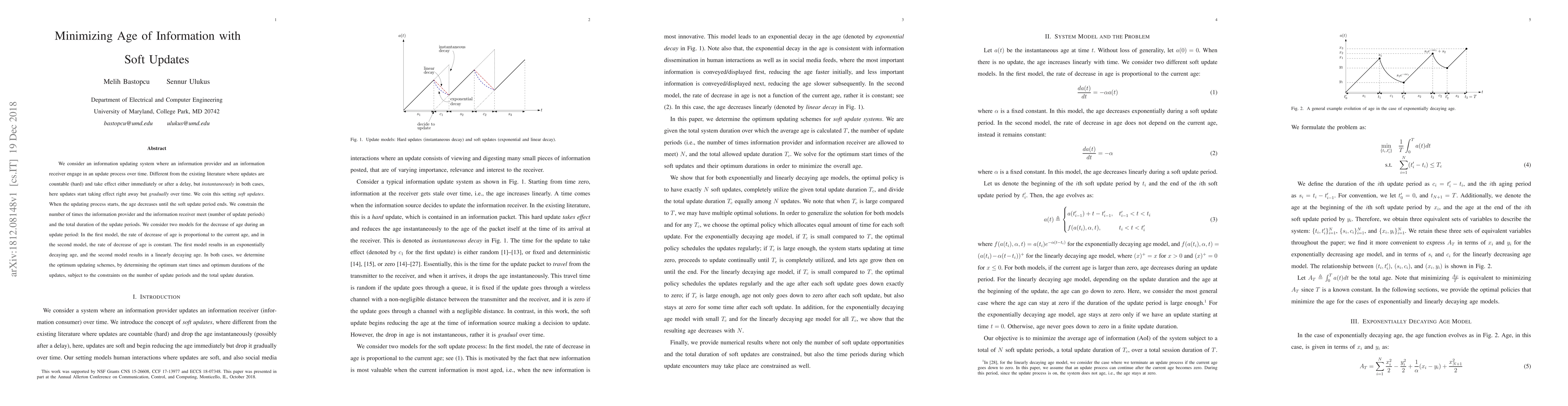 The paper presents mathematical models and optimization techniques for minimizing age of information under soft update regimes, introducing exponential and linear decay models with corresponding optimal update strategies.