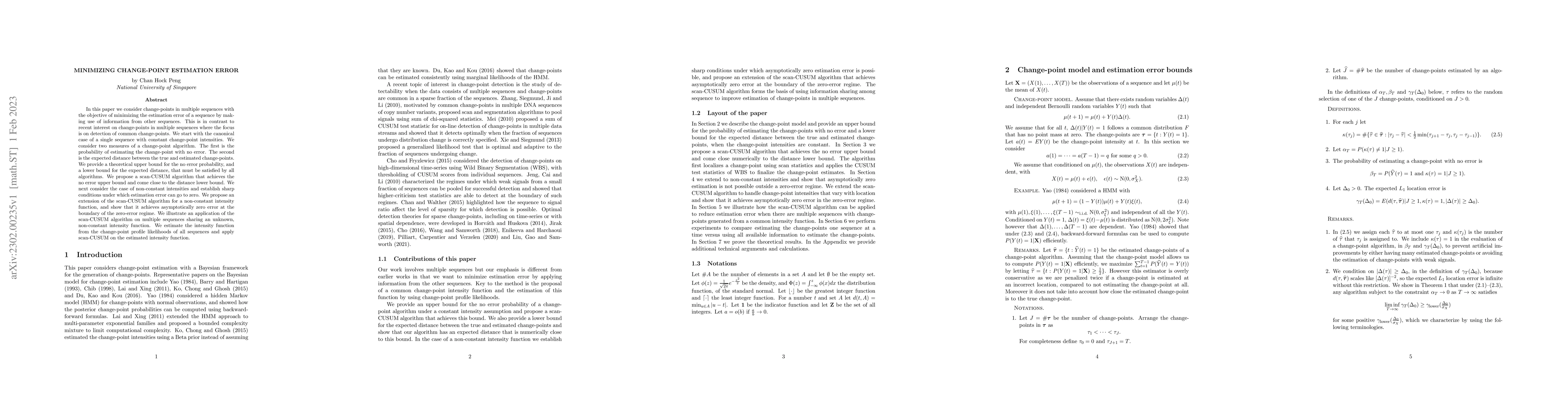 In this paper we consider change-points in multiple sequences with the objective of minimizing the estimation error of a sequence by making use of information from other sequences. This is in contrast to recent interest on change-points in multiple sequences where the focus is on detection of common change-points. We start with the canonical case of a single sequence with constant change-point intensities. We consider two measures of a change-point algorithm. The first is the probability of estimating the change-point with no error. The second is the expected distance between the true and estimated change-points. We provide a theoretical upper bound for the no error probability, and a lower bound for the expected distance, that must be satisfied by all algorithms. We propose a scan-CUSUM algorithm that achieves the no error upper bound and come close to the distance lower bound. We next consider the case of non-constant intensities and establish sharp conditions under which estimation error can go to zero. We propose an extension of the scan-CUSUM algorithm for a non-constant intensity function, and show that it achieves asymptotically zero error at the boundary of the zero-error regime. We illustrate an application of the scan-CUSUM algorithm on multiple sequences sharing an unknown, non-constant intensity function. We estimate the intensity function from the change-point profile likelihoods of all sequences and apply scan-CUSUM on the estimated intensity function.